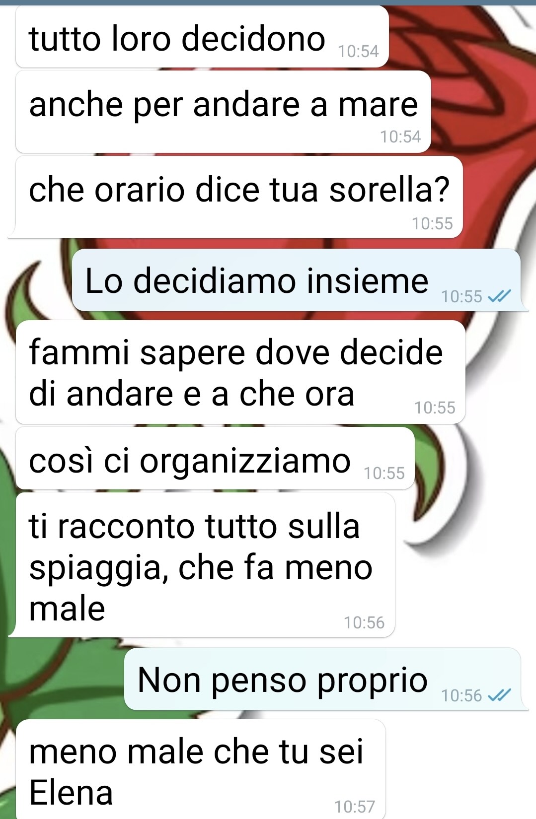 Elena precisa infatti che, contrariamente a quanto Alex sembra dare per scontato, non esistono né rivalità né differenze fisiche con la sorella che la mettano a disagio, anzi: la sua vita da gemella non è mai stata vissuta con conflitti o sensi d’inferiorità.