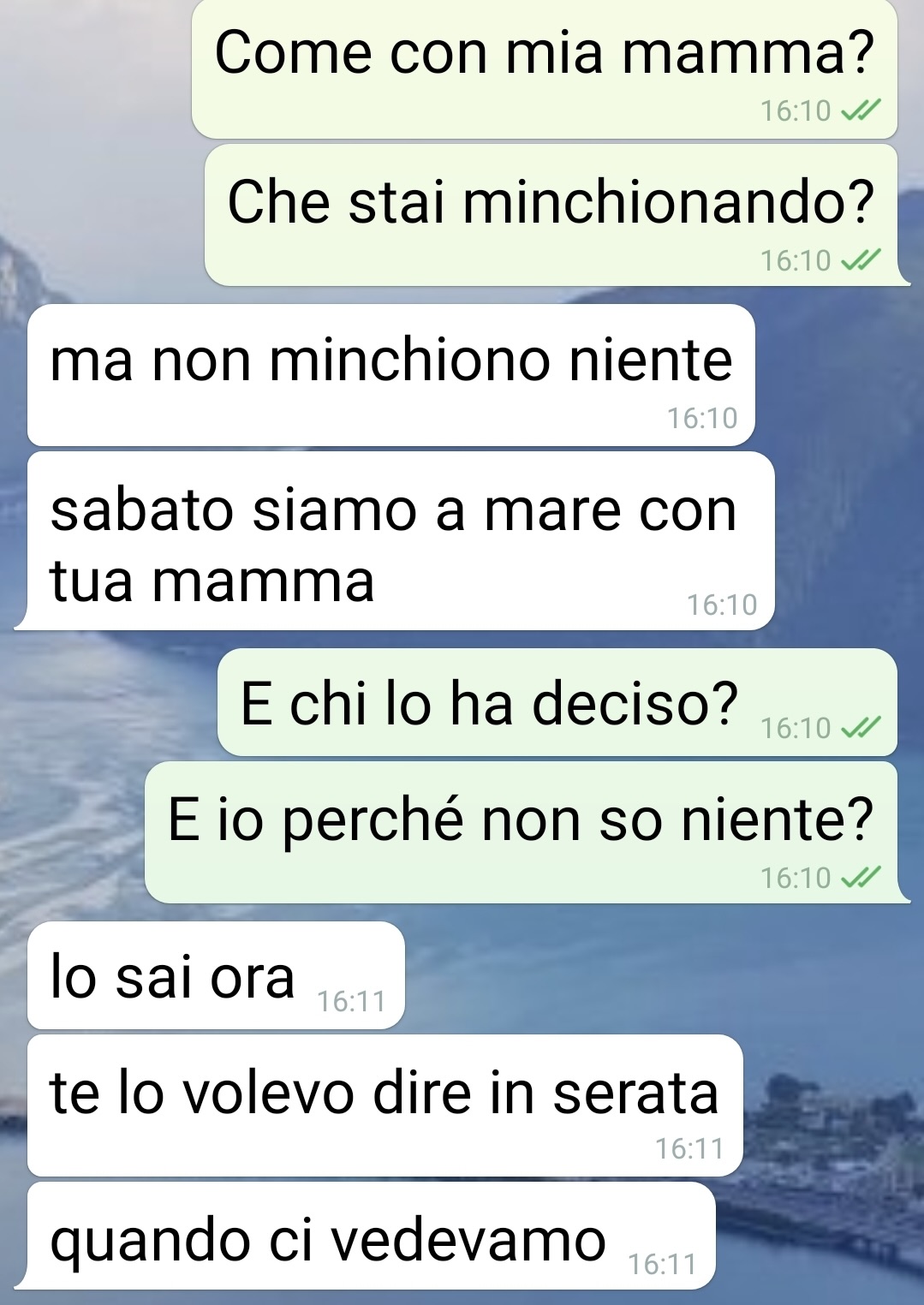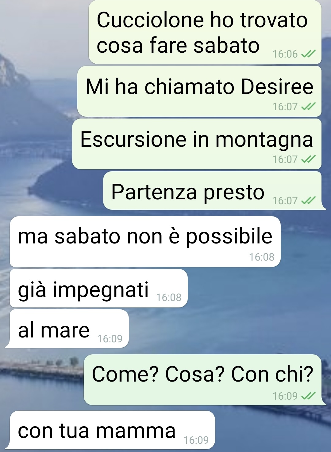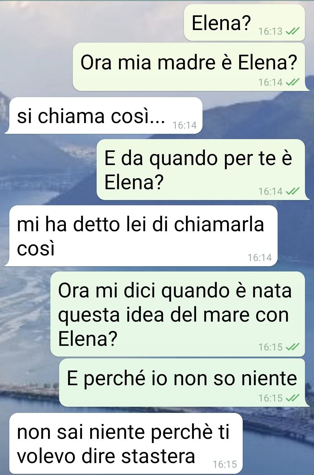 Sono Luisa, 25 anni studentessa che da un anno è fidanzata con Salvo, coetaneo che studia e lavora. Solo il mese scorso mi sono persuasa, convinta ormai del nostro rapporto, a presentare Salvo ufficialmente alla mia famiglia. Ovvero a mia sorella, che sta fuori, e a mia madre. E qui arriviamo allo snodo cruciale della questione, mia madre appunto. Elena. Ha 47 anni ed è ufficialmente sola da quando sono nata. Dico ufficialmente perché non è sposata e non ha un compagno, ma di storielle e tresche ne ho perso il conto. Niente di male, è una donna bellissima, in formissima e che fa girare la testa praticamente a tutti gli uomini eterosessuali. Lei non so quanta colpa reale abbia in questa storia, perché comunque è una ingenua. Ma su Salvo di dubbi non credo ce ne possano essere. È un porco punto e basta. Vi basterà leggere questa chat tra me e lui e mia madre per capire.