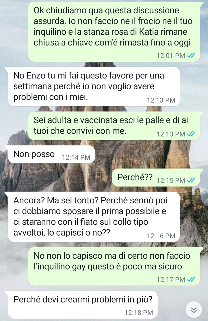 Enzo racconta che la richiesta non era semplicemente di apparire un po’ più riservato o formale, ma di interpretare un personaggio diverso “fin nel midollo,” una persona che rappresenta l’opposto della sua vera natura. Di fronte a questa assurda pretesa, Enzo ha rifiutato categoricamente, trovando inaccettabile la richiesta di negare la propria identità. A quel punto, Flora ha reagito chiedendogli di lasciare casa loro per tutta la durata della visita dei genitori, suggerendogli di soggiornare in un albergo.
