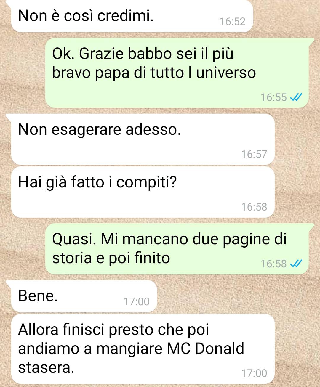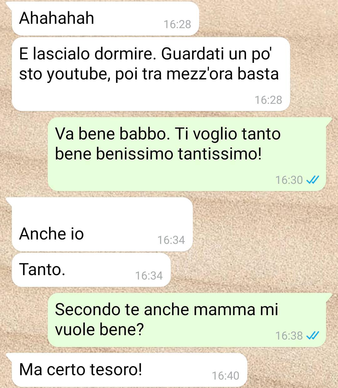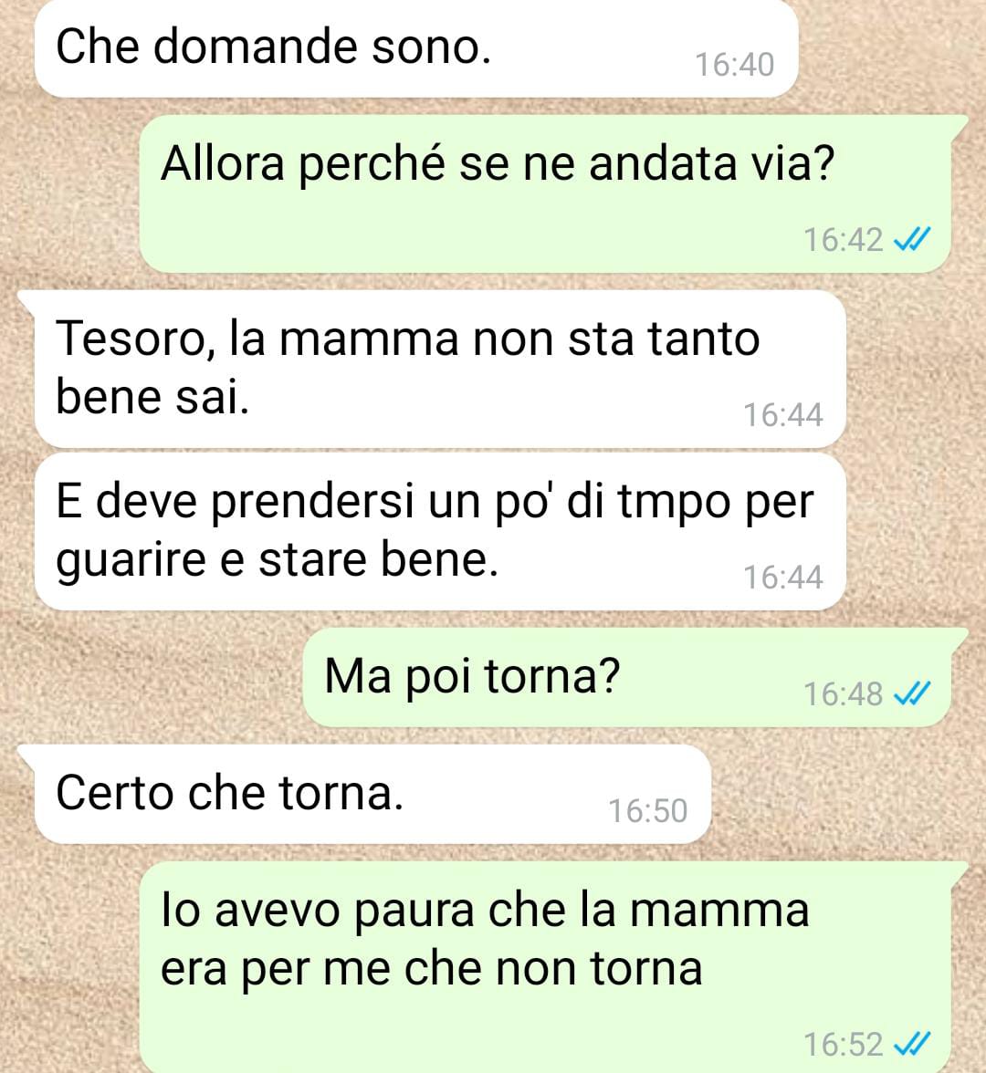 Il nostro fan racconta di aver deciso di condividere i messaggi scambiati con suo figlio Marco in un momento molto difficile e delicato della sua vita. La nostra fan spiega che sua moglie Marina ha lasciato la casa familiare, affidandogli la gestione quotidiana di tutto.