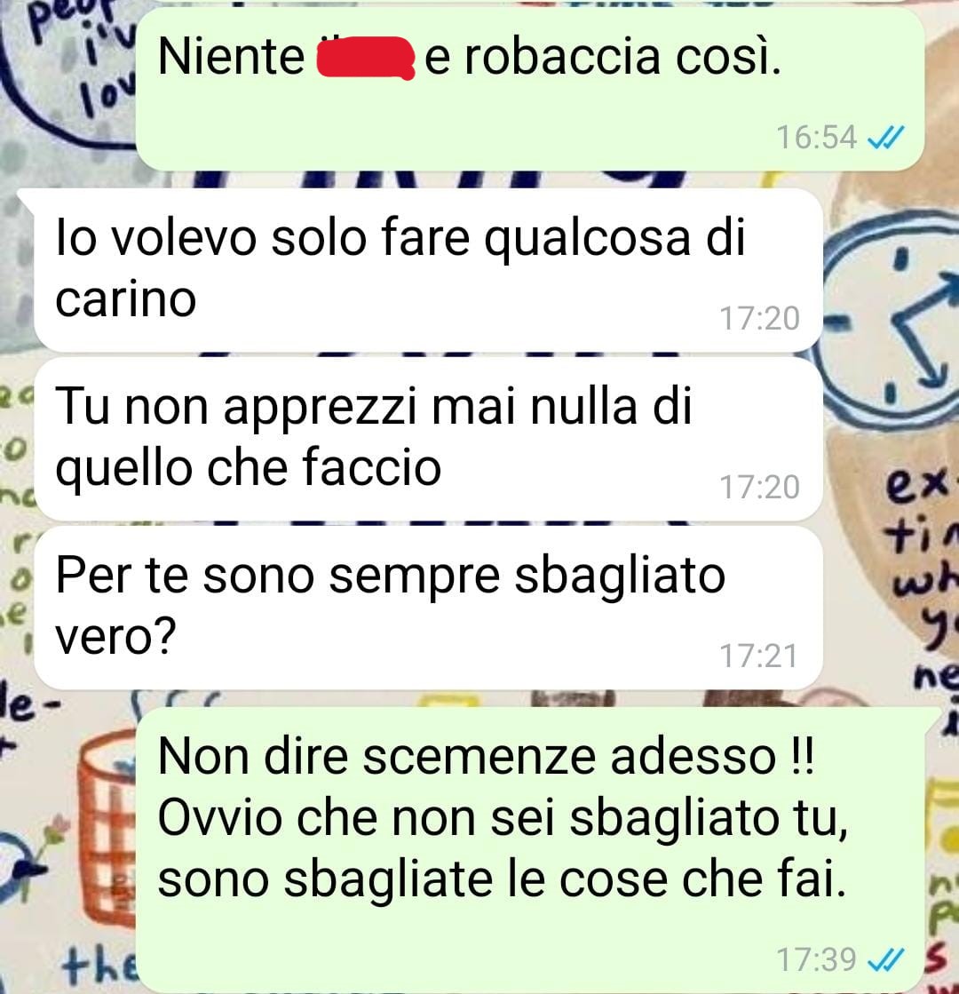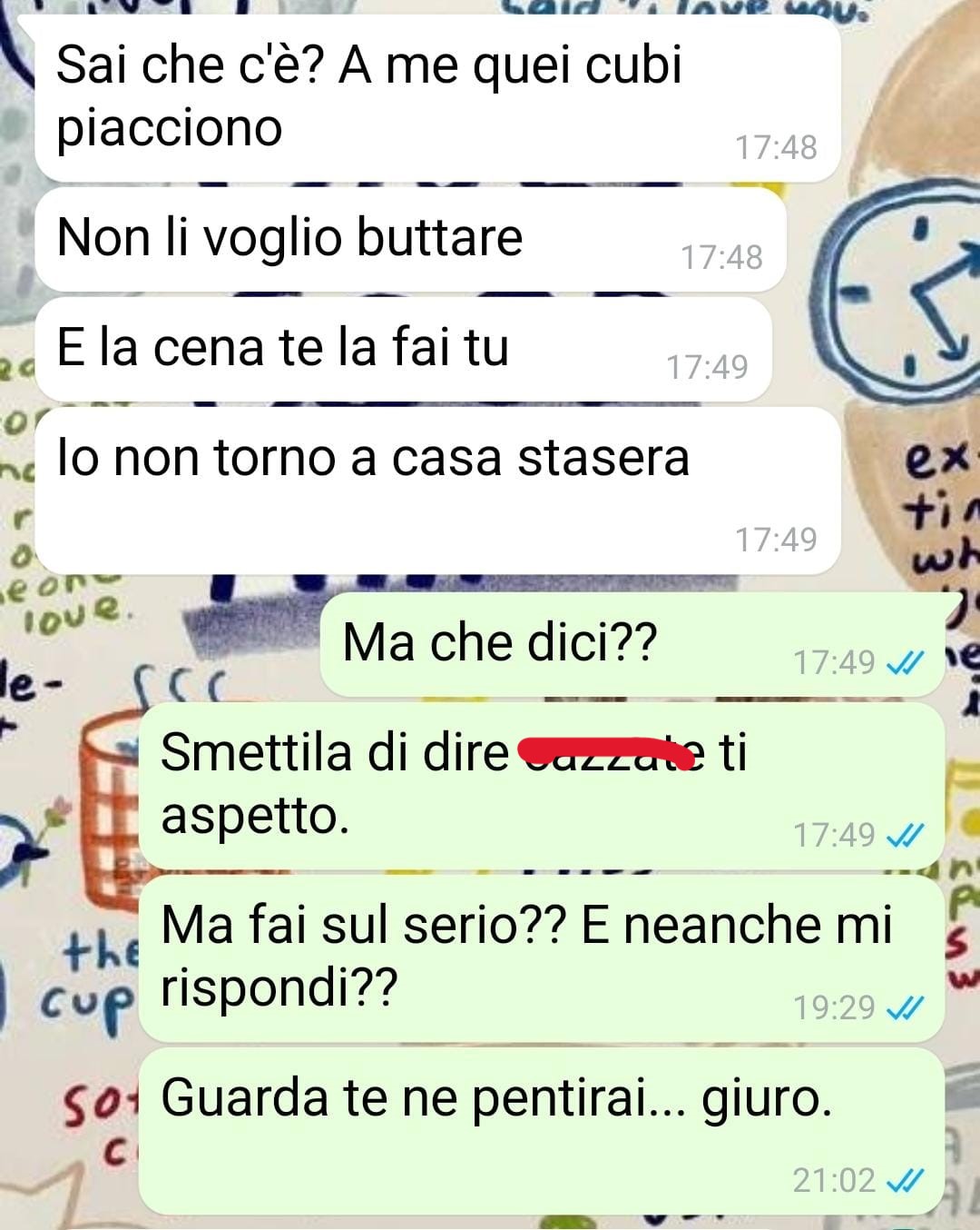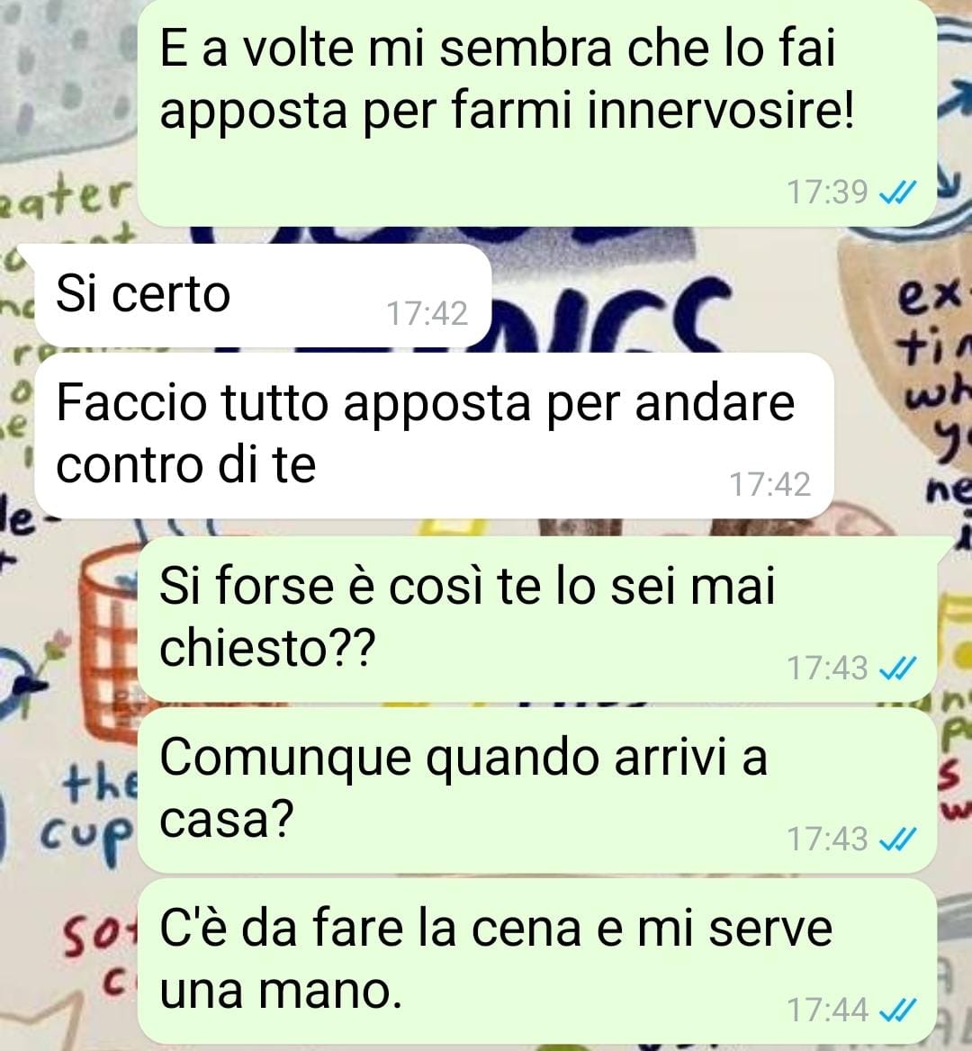 Per lei si tratta di un gesto imperdonabile, non solo per il contenuto materiale della discussione, ma per quello che rappresenta: una rottura della fiducia, una mancanza di condivisione e, forse, anche una certa dose di provocazione. La chat che ha deciso di condividere con Commenti Memorabili documenta tutta la conversazione e vuole essere una prova del fatto che non sta esagerando né inventando nulla.