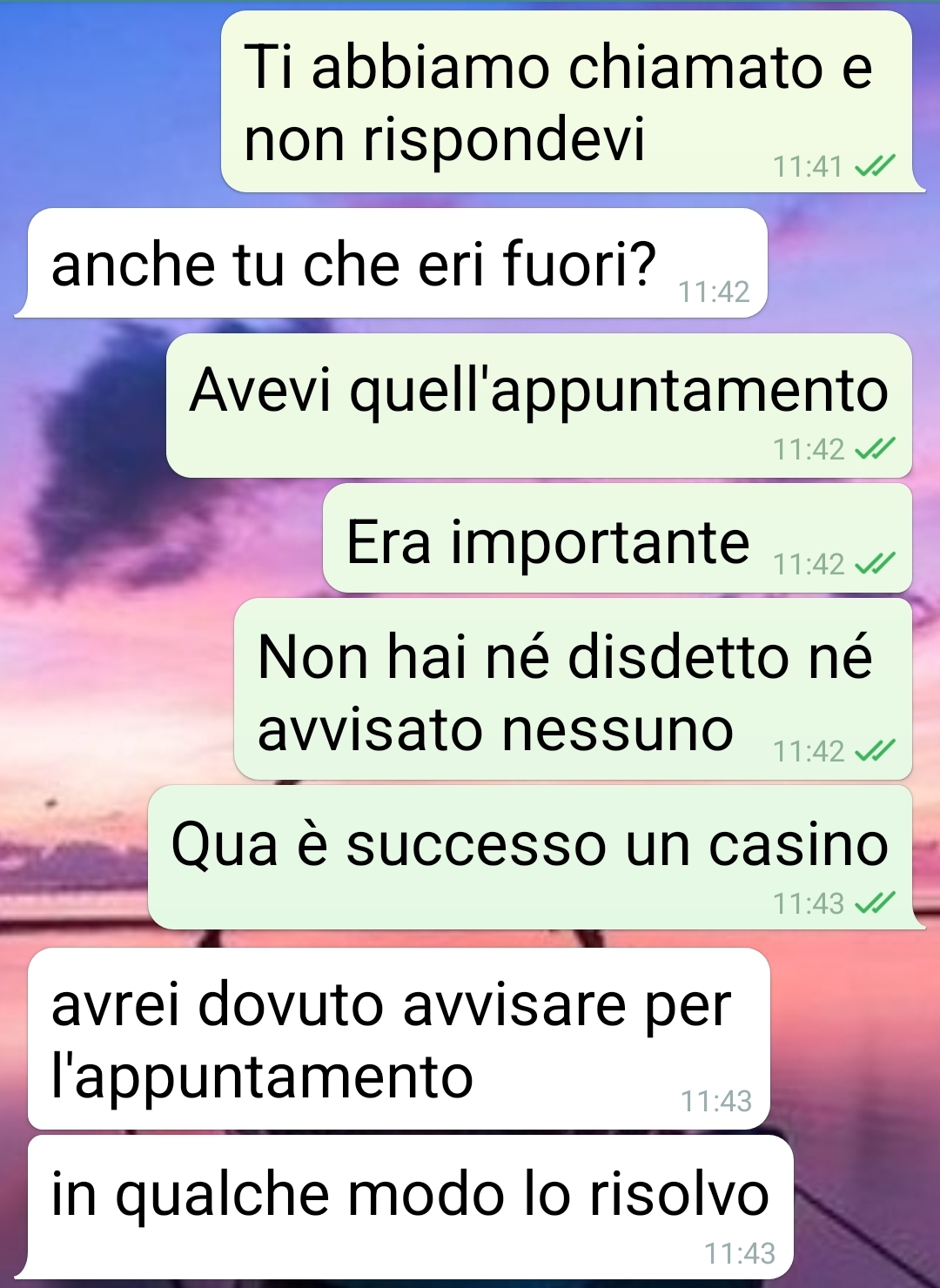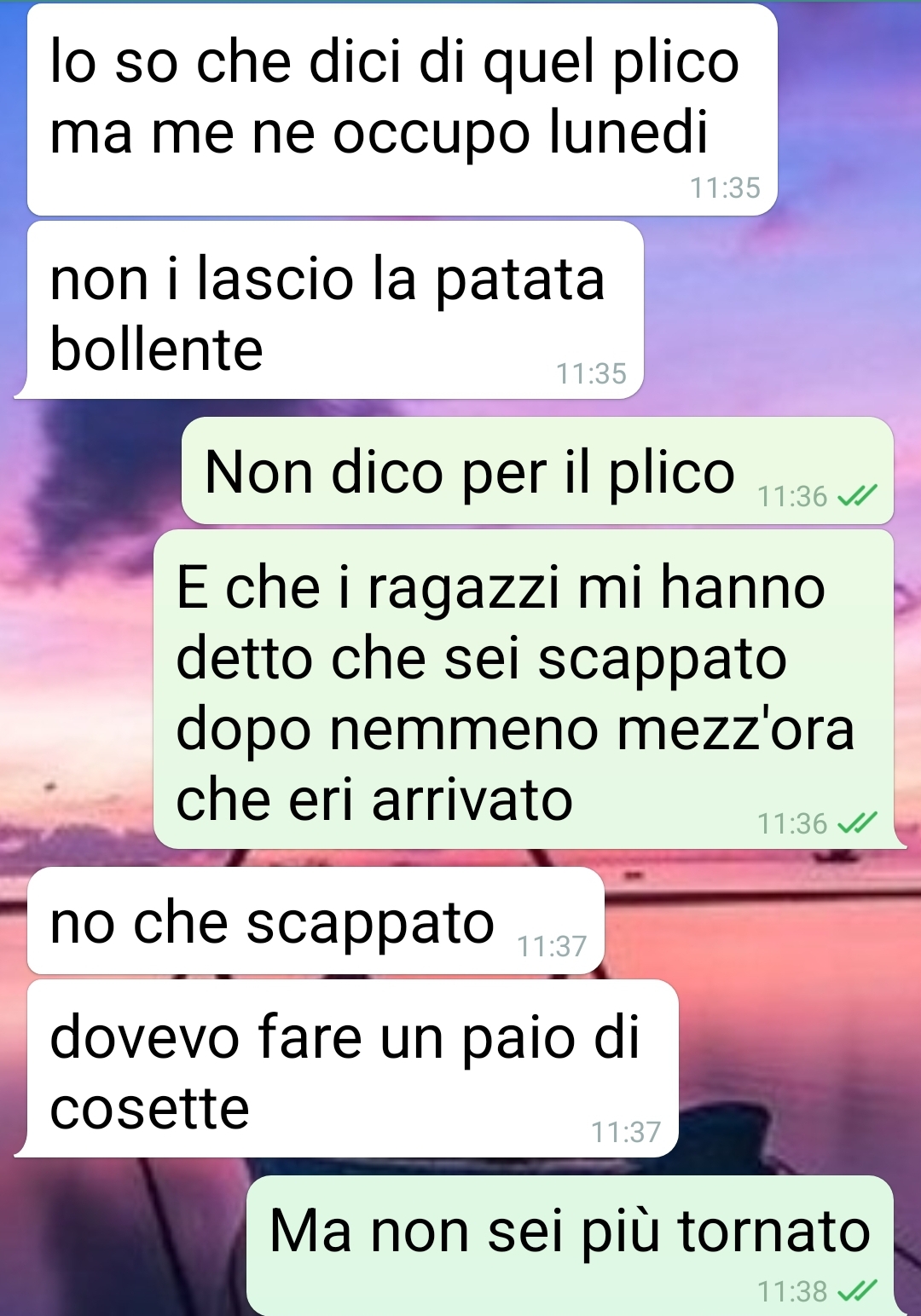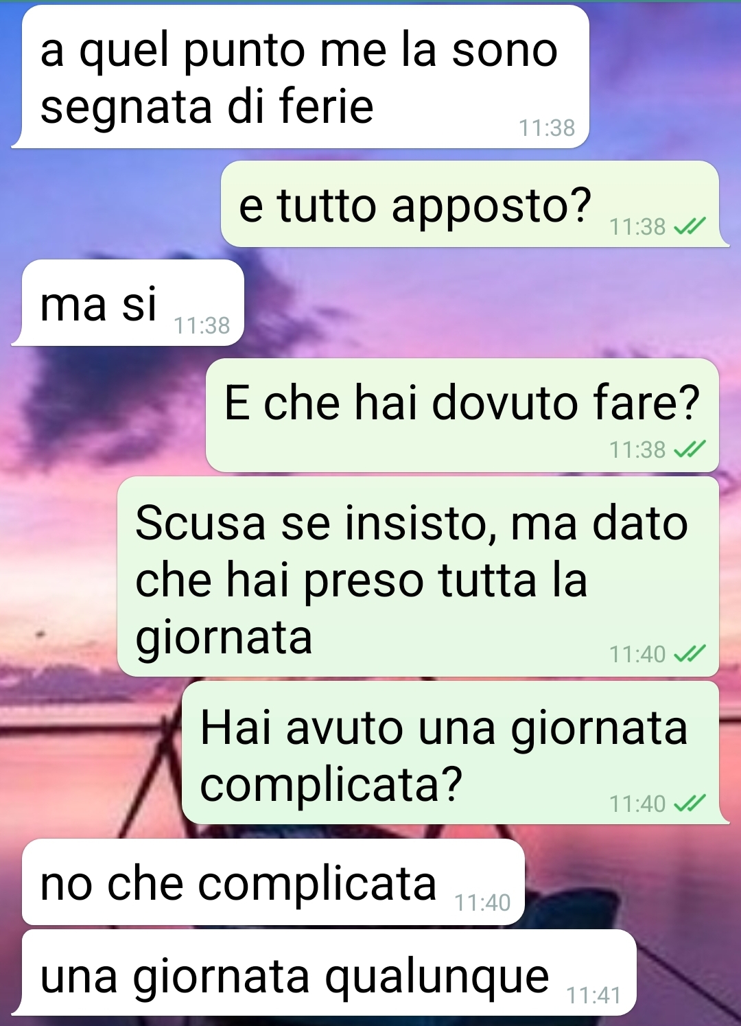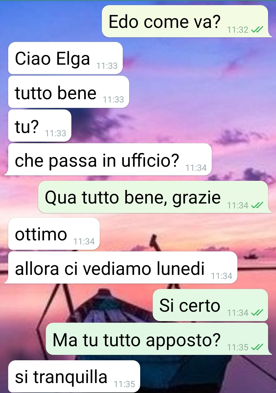 Il mio collega Edo ha vissuto una giornata qualunque a suo dire. Io sono ancora scioccata per quello che è successo. Sono Olga, vi seguo da tanto e oggi ho qualcosa per voi. Una chat col mio collega Edo. Persona professionale e puntuale, che qualche giorno fa però è scappato dall’ufficio senza avvisare e dando buca per un appuntamento molto importante. Sono riuscita a contattarlo solo il giorno seguente, con questi messaggi. Ci ho pensato un po’ se pubblicarli o meno, magari cancellando i nomi. Ma considerando quello che è venuto fuori, la sua personalità in certi ambiti, credo che non abbia niente da obiettare. Per qualche screen tra colleghi, normale amministrazione. Niente di che. Io però ci vedo le cose più allucinanti possibili. Mi ha detto certe cose che farebbero rimanere di sale alche una statua di marmo. E lui parla di giornata qualunque. Solo un paio di intoppi. Non so se avrò il coraggio di parlargli quando ritornerà in ufficio. E quella povera moglie…