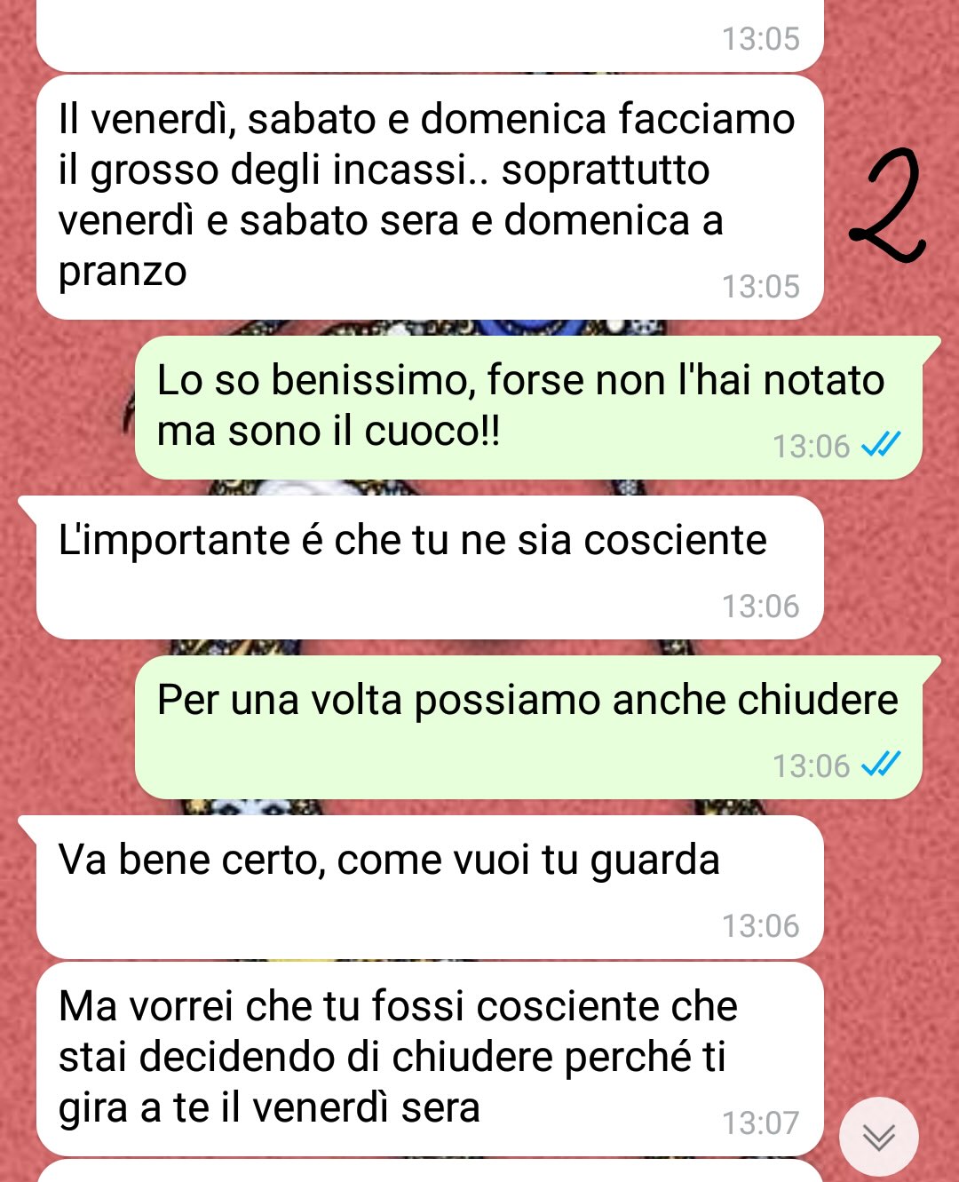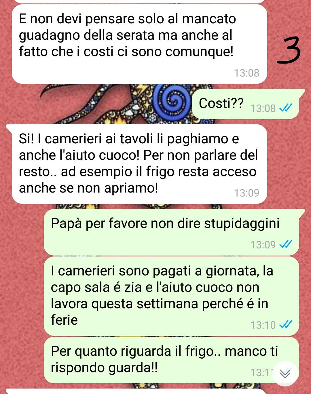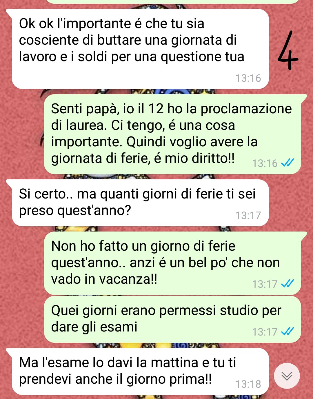 Mi chiamo Roberto e in estate discuterò la mia tesi di laurea: sono emozionato e felice perché finalmente finirò l’università! Certo non cambierà poi molto dato che io un lavoro ce l’ho già: sono cuoco nel ristorante di famiglia, un ristorante che è gestito ora da mio padre e mia madre e che prima era di mio nonno paterno. Il mio lavoro mi piace: ho sempre amato cucinare, quindi anche se, devo ammetterlo, c’è stata una grande pressione in famiglia perché io continuassi l’attività familiare, alla fine io sono contento. D’altronde non a tutti capita di poter non solo fare il lavoro che si ama ma anche farlo in proprio, in una attività ce è solo tua: certo, il ristorante è della mia famiglia, non solo mio, ma lo sarà in futuro e io così, di fatto, lavoro non per un datore di lavoro ma per me stesso e per il mio futuro. Tutto bene quindi tranne che per un dettaglio: finite le superiori io ho iniziato subito a lavorare come cuoco al ristorante dei miei, prima come “aiutante” e poi via via con responsabilità sempre maggiori.. ma io avrei voluto fare l’università! Studiare e lavorare insieme è difficile ma io lo avrei fatto se non fosse che mio padre si è fermamente opposto: io ero giovane e mi sono rassegnato, anche perché non avevo i soldi per pagare le tasse universitarie.. Ma, dopo alcuni anni di lavoro, a 23 anni, mi sono iscritto all’università e tra poco mi laureo in economia.. ora leggete cosa pensa mio padre della cosa…