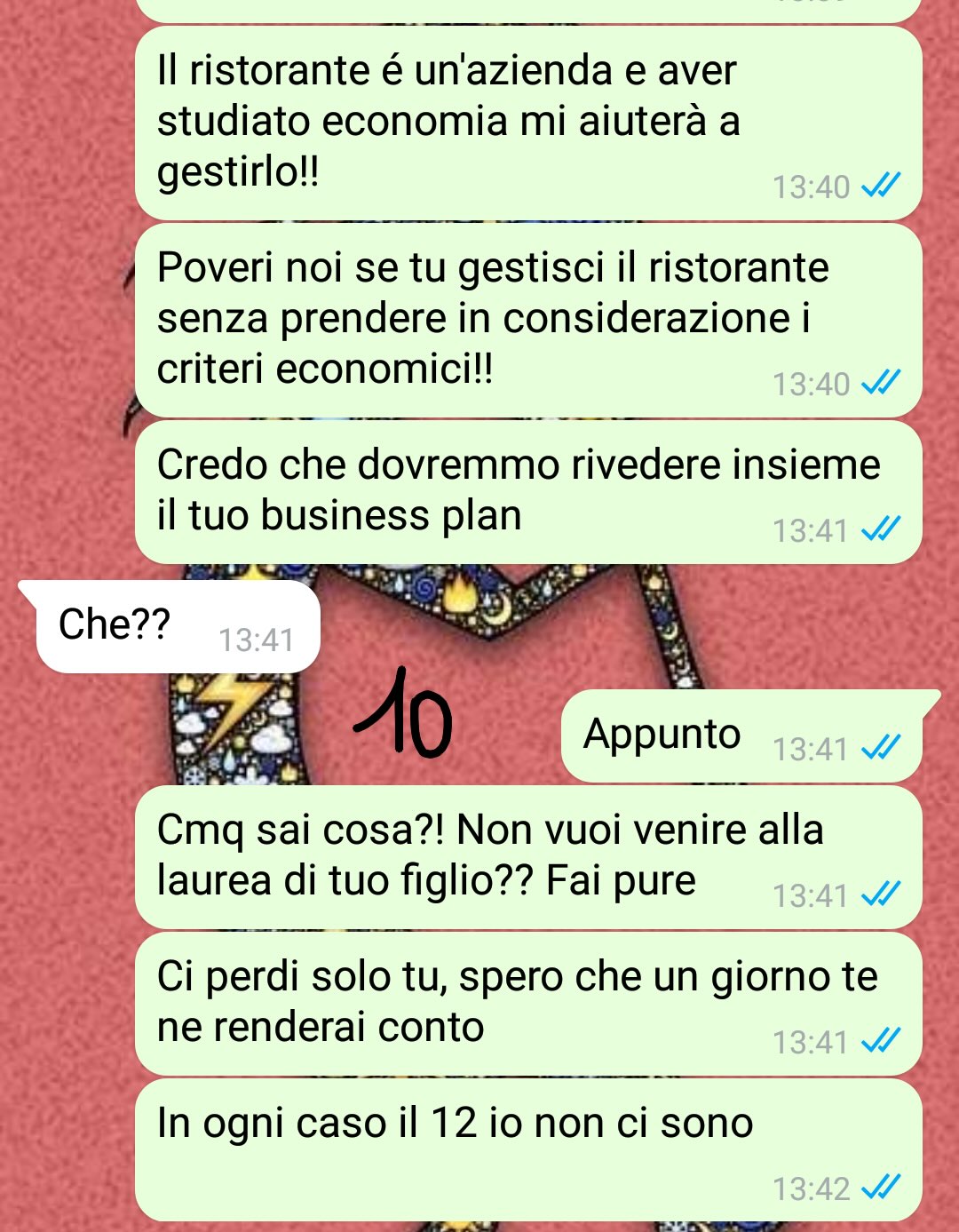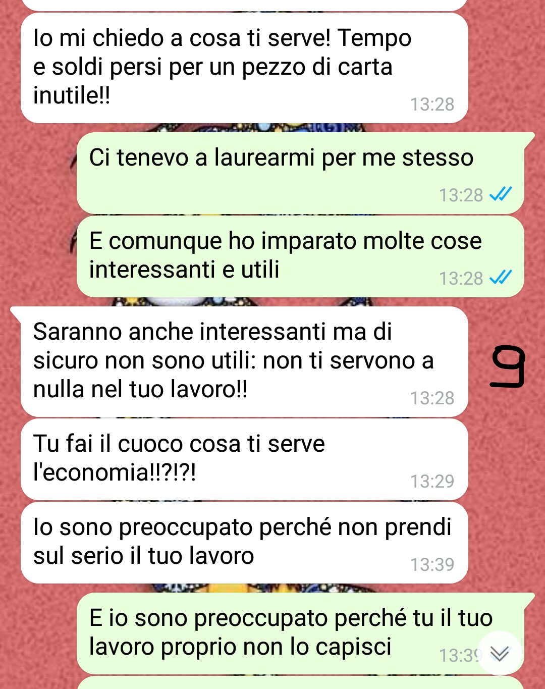 Tutto questo, però, è solo una parte della storia. C’è un dettaglio che continua a pesargli: una scelta che non ha potuto fare subito. Finite le scuole superiori, avrebbe voluto iscriversi all’università, ma suo padre si è fermamente opposto. All’epoca, Roberto era troppo giovane per imporsi e, senza la possibilità di sostenere autonomamente le spese, ha messo da parte quel desiderio. Ha iniziato a lavorare come aiuto cuoco nel ristorante di famiglia e, anno dopo anno, si è guadagnato sempre più fiducia e responsabilità.