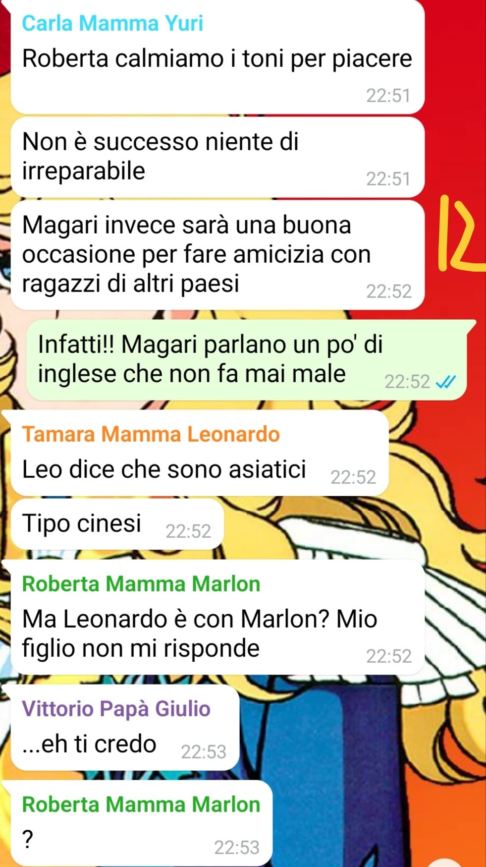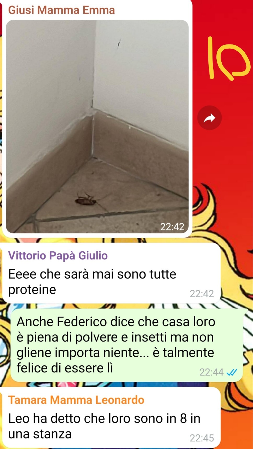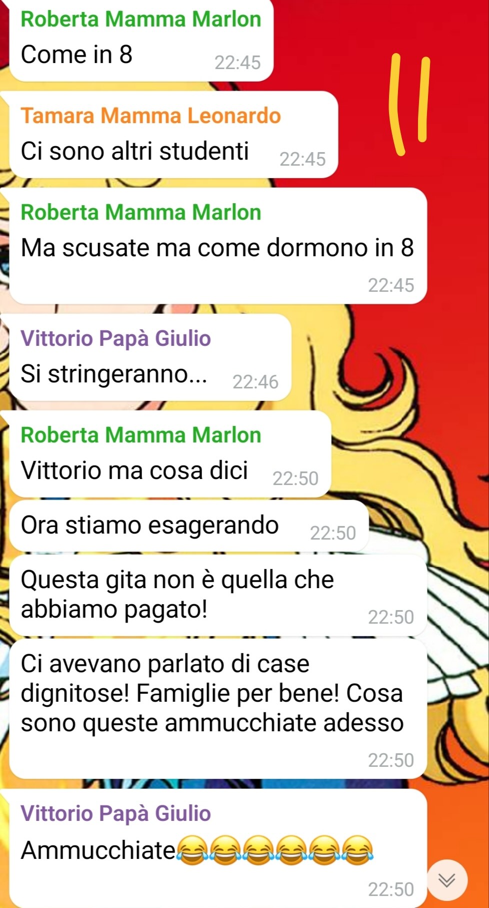 I problemi sono iniziati subito dopo l’atterraggio. Il nostro amico e i suoi compagni si stavano godendo l’inizio della vacanza, mentre nei telefoni dei genitori esplodeva il panico. Attraverso alcuni screenshot presi direttamente dal telefono della madre, Federico ha testimoniato l’agitazione crescente nel gruppo, dove genitori iperprotettivi si lanciavano in commenti, dubbi e allarmismi, spesso esagerati rispetto alla reale situazione vissuta dai ragazzi.