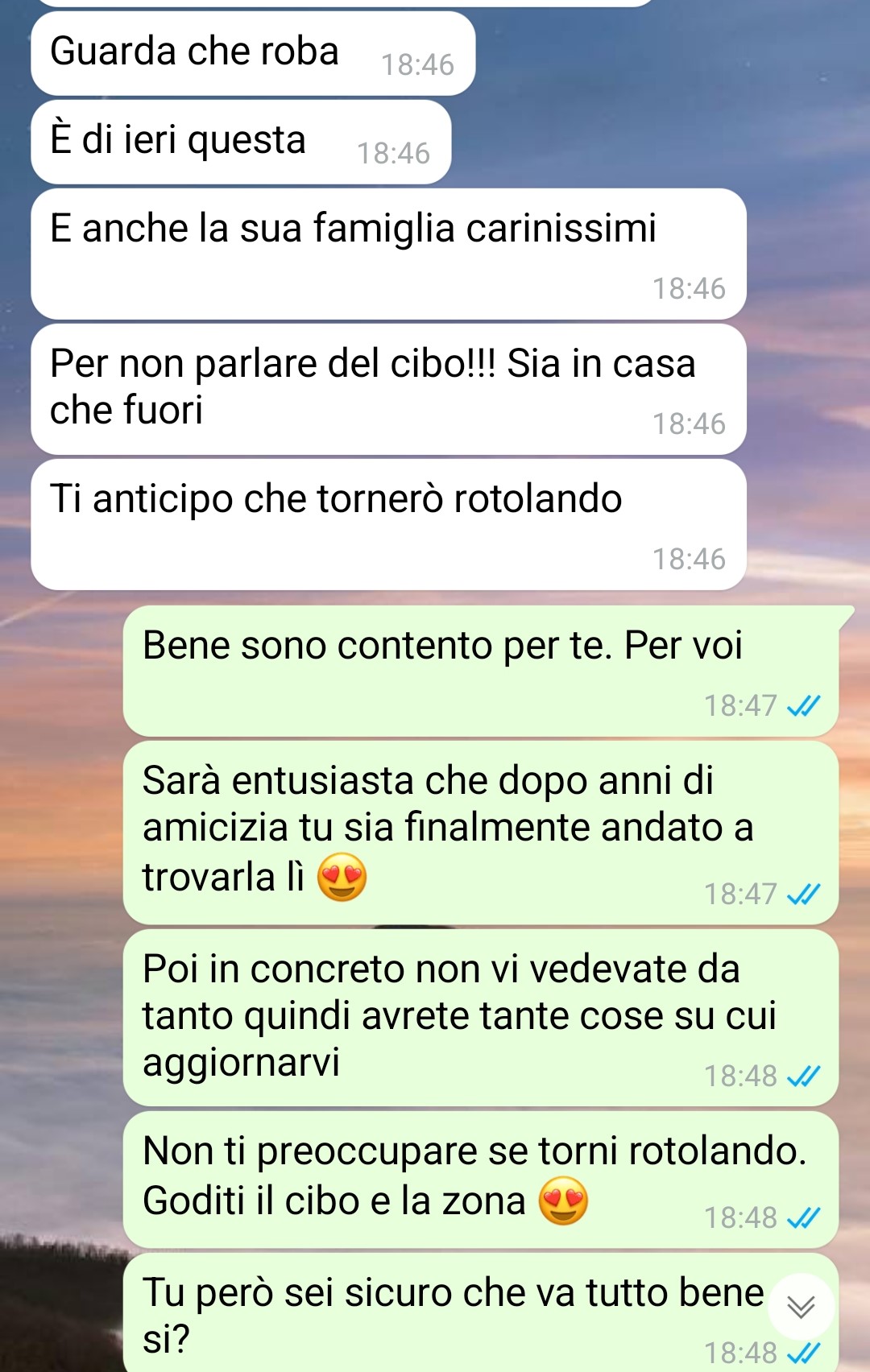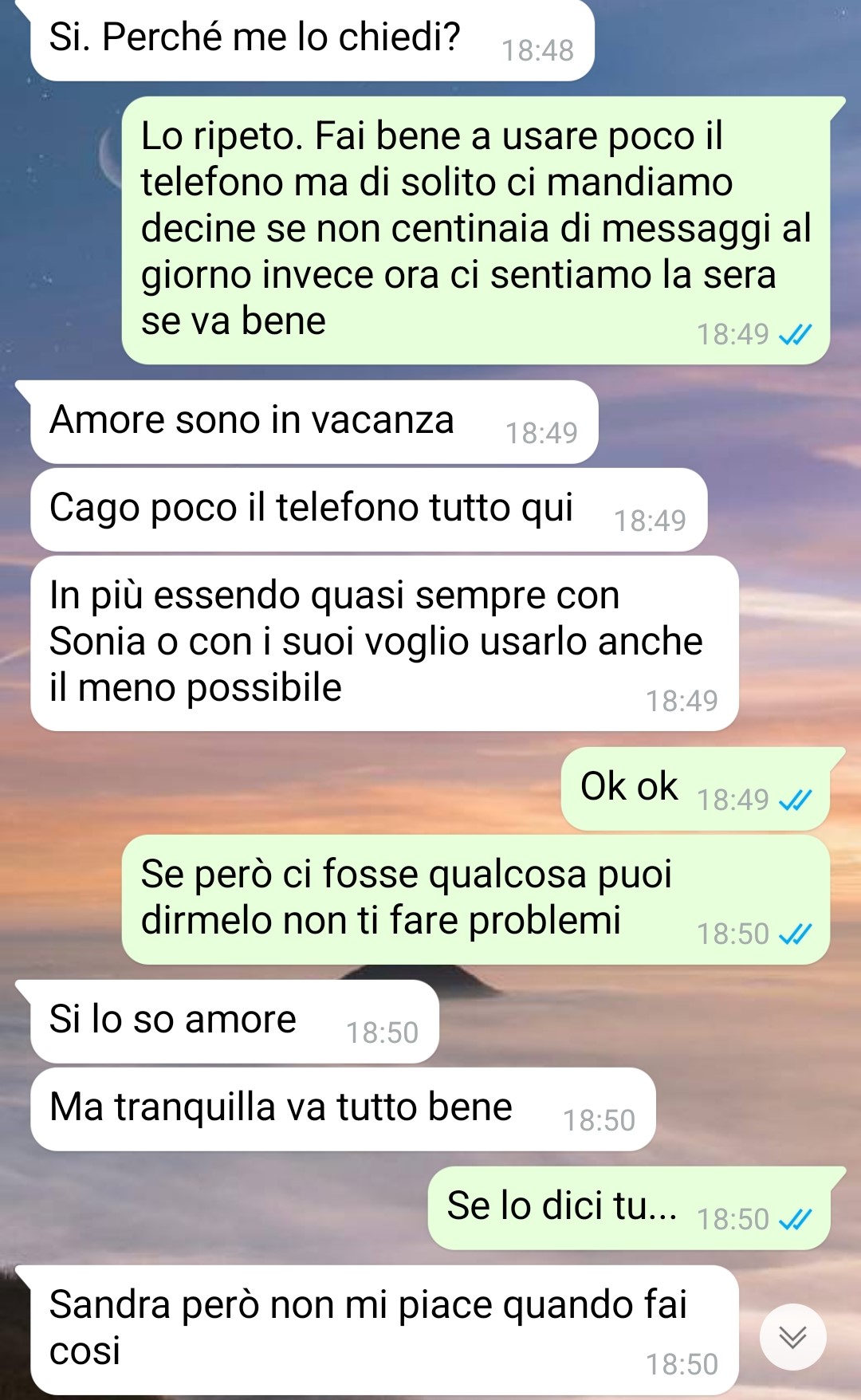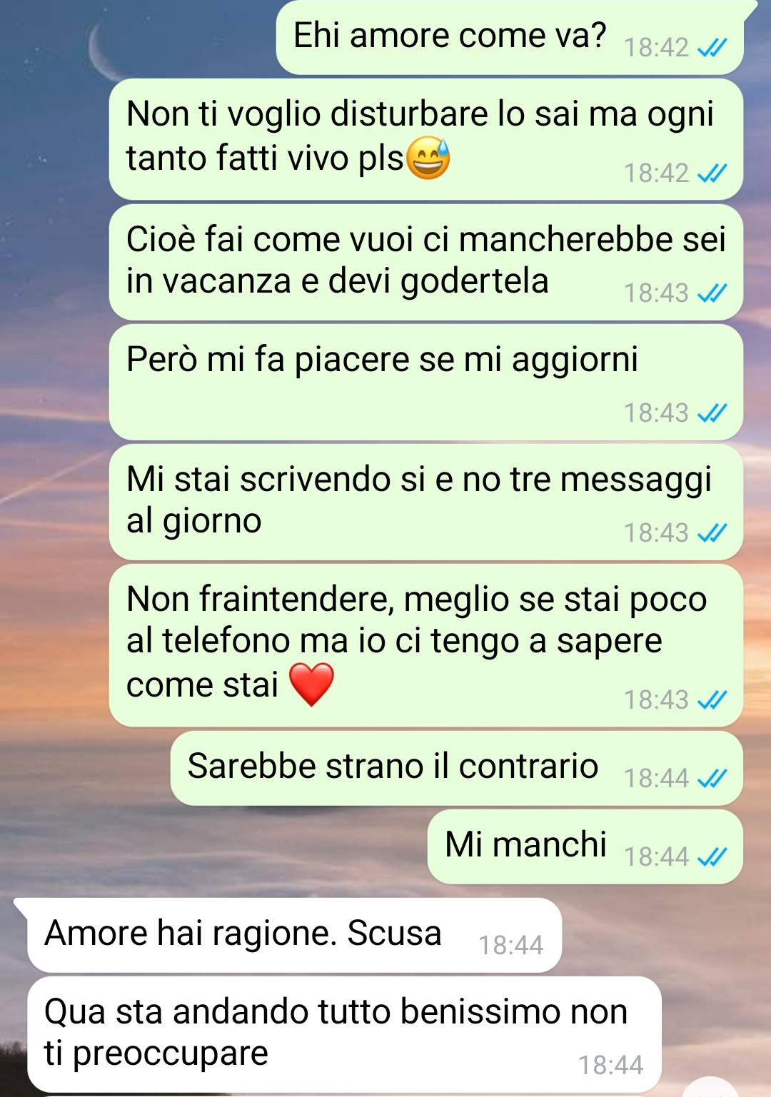 La situazione con il mio fidanzato è estremamente tesa e al momento forse penso che non lo sia neanche più. Non lo so sinceramente, e non so se provare a riallacciare il rapporto. Comunque, personalmente rovo che sia una cosa grandissima decidere di dedicarsi a una sola persona, di dare tutto a lei, di costruire qualcosa con lei e arrivare così a un grado di conoscenza, intimità e amore che credo solo in questo modo sia possibile raggiungere. Trovo anche però che sia una scelta, e una scelta non facile: significa rinunciare a miliardi di altre possibilità, al brivido della seduzione e del flirt, alle lusinghe delle infatuazioni. Significa affrontare la realtà con tutti i suoi lati negativi, combattere per mantenere viva la fiamma, mettersi continuamente in gioco. E tutto questo non è né ovvio, né scontato, né tanto meno facile. Per me però ne vale la pena e non credo che vorrei né riuscirei mai ad avere altri tipi di relazioni. Al tempo stesso, le persone hanno delle pulsioni incontrollabili. Dato che il mio ragazzo era in vacanza dalla sua amica Sonia, mi sembrava l’occasione giusta per parlargliene, ma non è andata bene.
