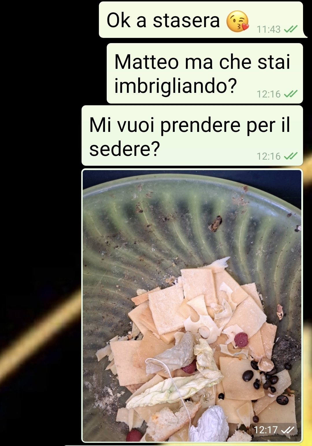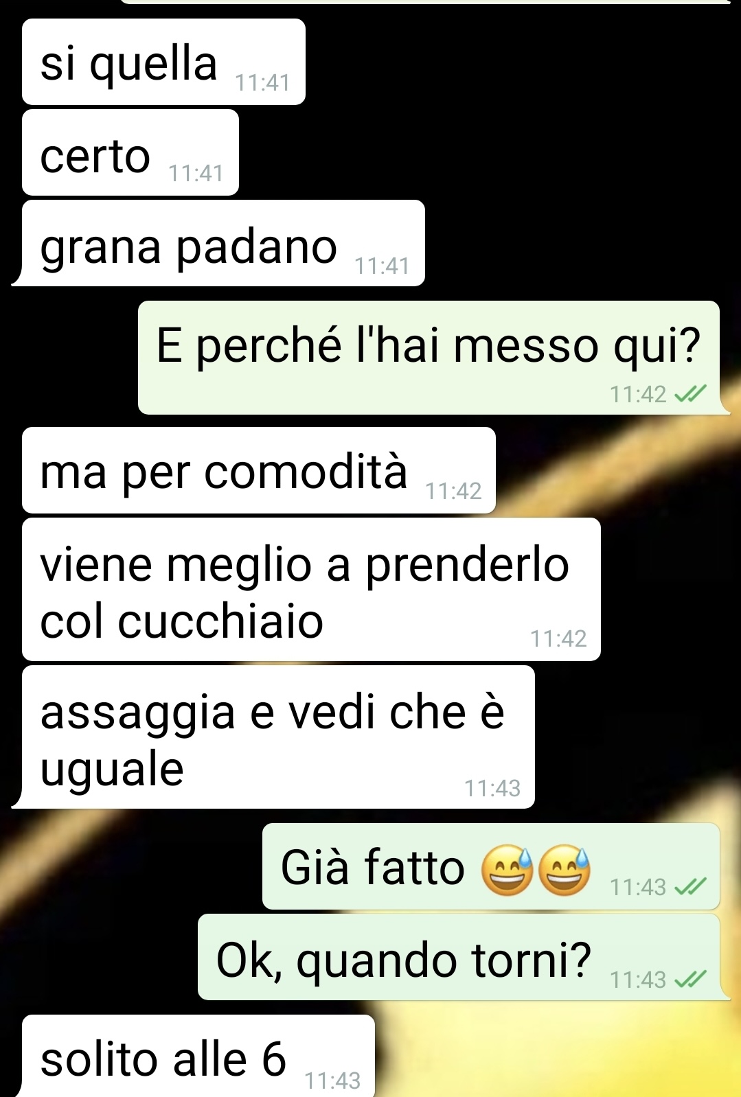 Il mio fidanzato mi sta praticamente prendendo in giro da sei mesi. Mi truffa da sei mesi. E vuole pure farmi passare per quella che ha torto. Se siete come me, che pensate che per amore si può e si deve rinunciare a qualcosa, leggetevi questa chat con Matteo e capirete quanto si può essere subdoli nella coppia. Ero veramente contenta, dopo 2 mesi di convivenza, che avesse abbandonato quel formaggio puzzolente che metteva nella pasta e che appestava tutta la casa. Finalmente solo grana in frigorifero. Per me è una grande dimostrazione di amore. Ma una lezione di yoga annullata gli ha messo i bastoni tra le ruote al bugiardo. Si perché mi ha fatto scoprire l’inganno con cui mi truffa da sei mesi. E la cosa peggiore è che non solo non è pentito, ma vuole colpevolizzare me. Tipico di chi è abituato dominare l’altro. Ma con sbatte e si fa male. Non ha capito chi sono io, caro “mister braccino corto prendo in giro e mi sento furbo”.