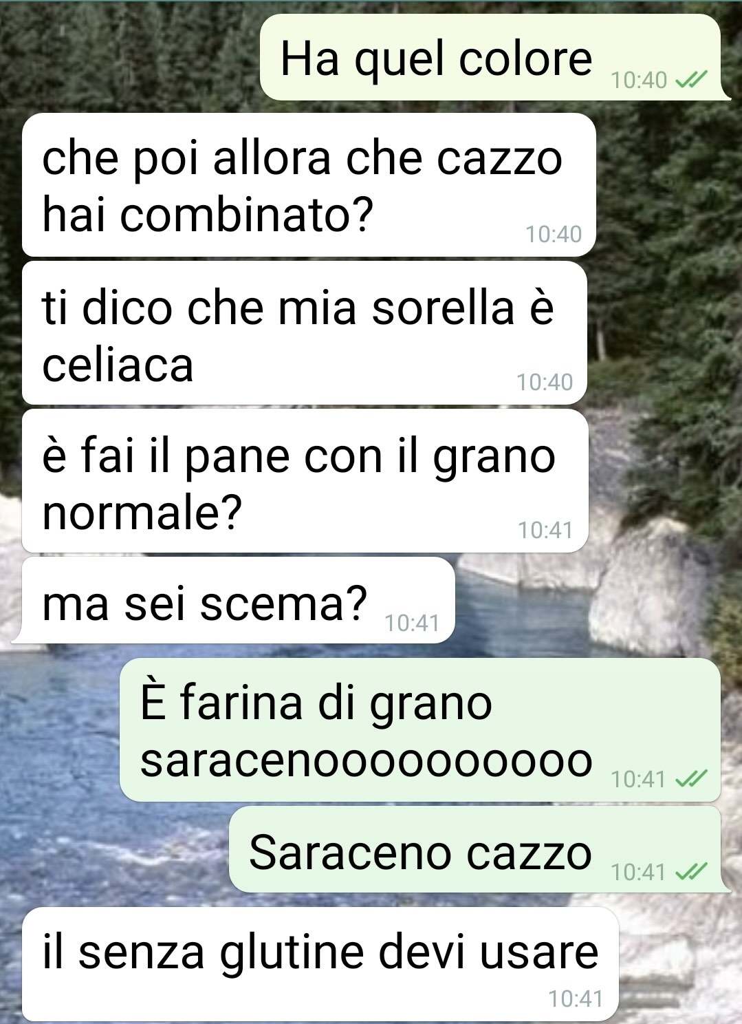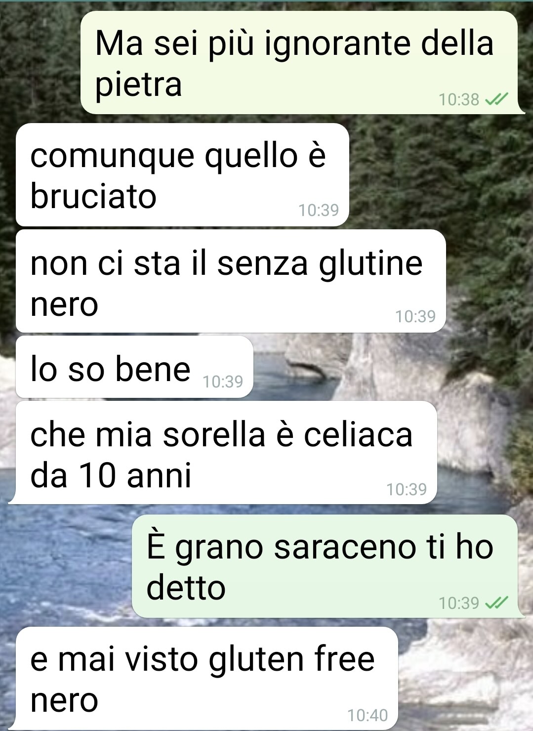 La nostra fan ha condiviso con noi una conversazione avuta con il suo compagno in una situazione che, a suo dire, rappresenta perfettamente il classico esempio di quando un uomo è convinto di sapere tutto… anche quando non sa davvero nulla. In questo caso, il tema è il gluten free, argomento che il suo partner ritiene di conoscere molto bene per via della sorella, celiaca da tempo.