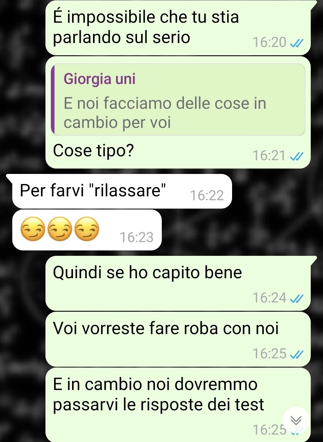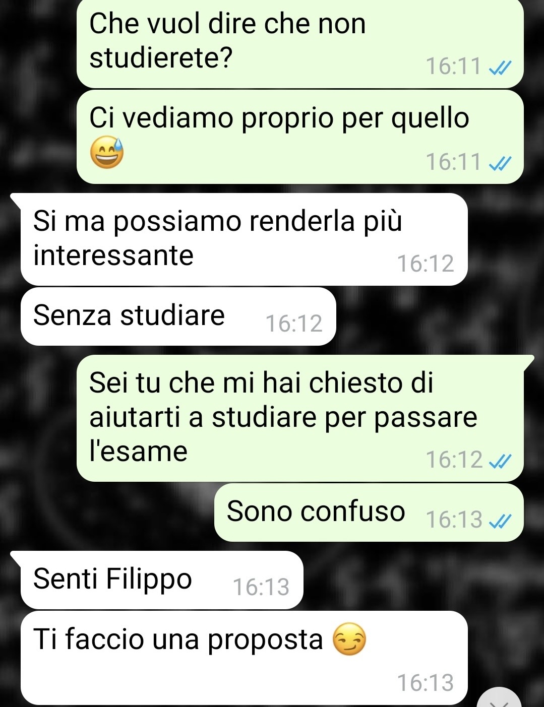 Il nostro fan, Filippo, è uno studente universitario al primo anno di Economia che ha già stretto nuove amicizie con alcuni colleghi del corso, tra cui la sua attuale fidanzata Cecilia. Con questo gruppo di nuovi amici, spesso si ritrova a studiare insieme per affrontare meglio gli esami, cercando di unire l’utile al piacevole. Tra le persone che fanno parte di questo gruppo c’è anche Giorgia, una ragazza conosciuta quest’anno con cui aveva deciso di preparare l’esame di contabilità.