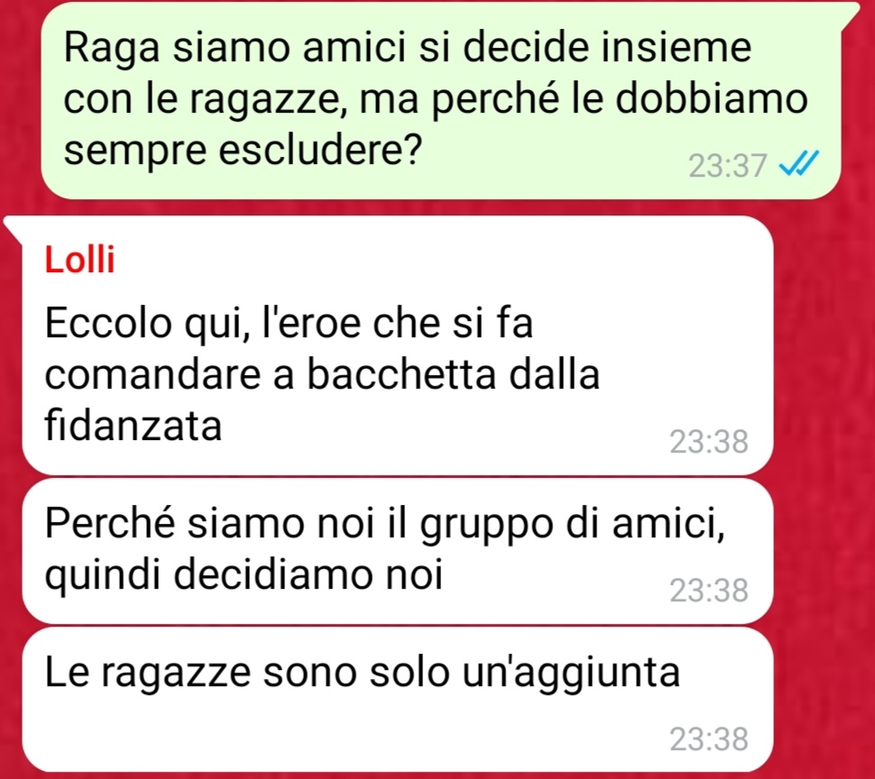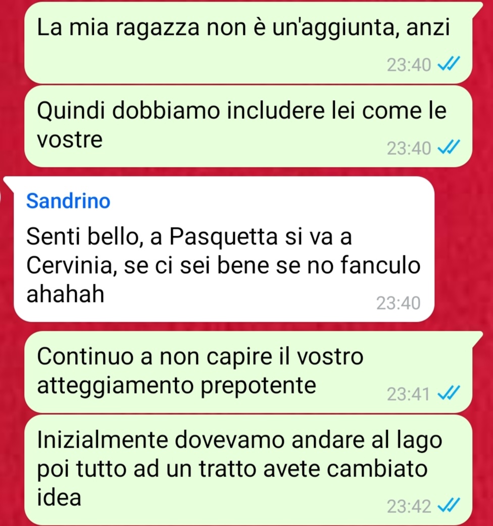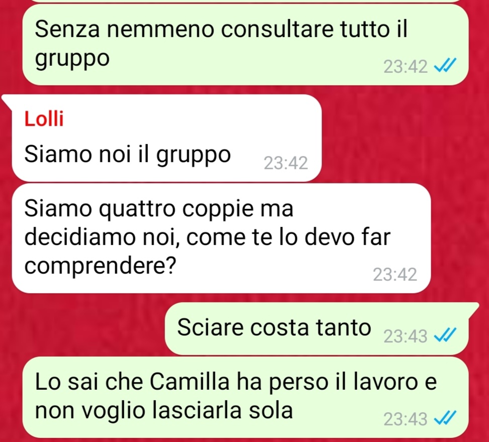 Quest’anno, la situazione si è complicata ulteriormente. Il gruppo di amici storici, con cui ha sempre condiviso questa ricorrenza, ha deciso all’improvviso di andare a sciare. Fin qui nulla di strano, se non fosse che la decisione è stata presa in modo del tutto unilaterale, senza confrontarsi con il resto del gruppo e, soprattutto, escludendo le fidanzate di alcuni membri, tra cui la compagna del nostro follower.