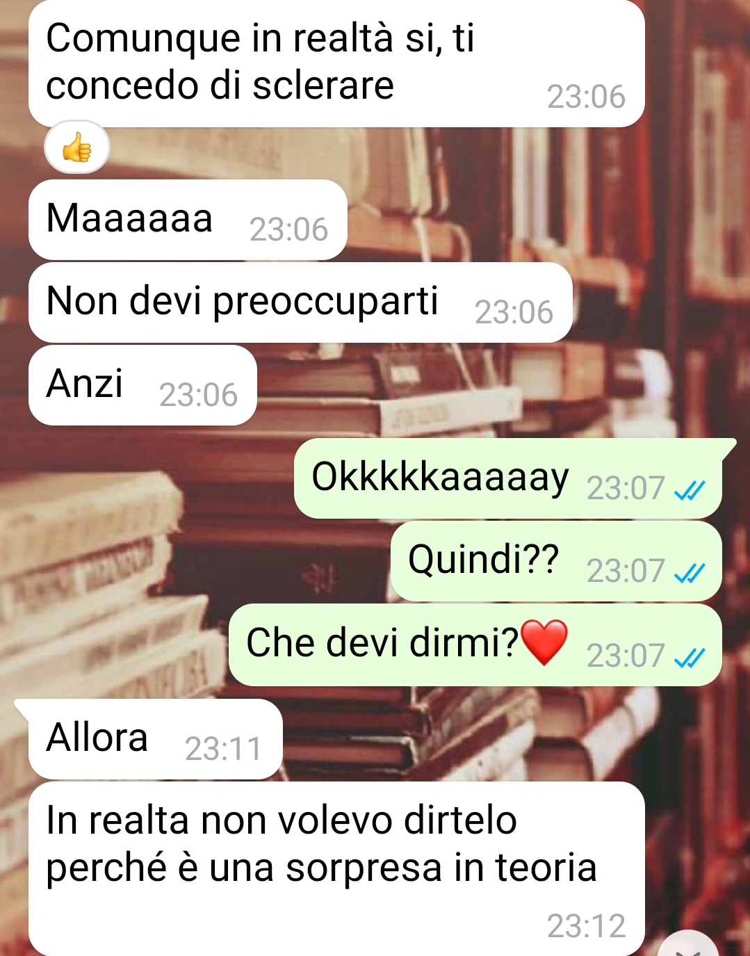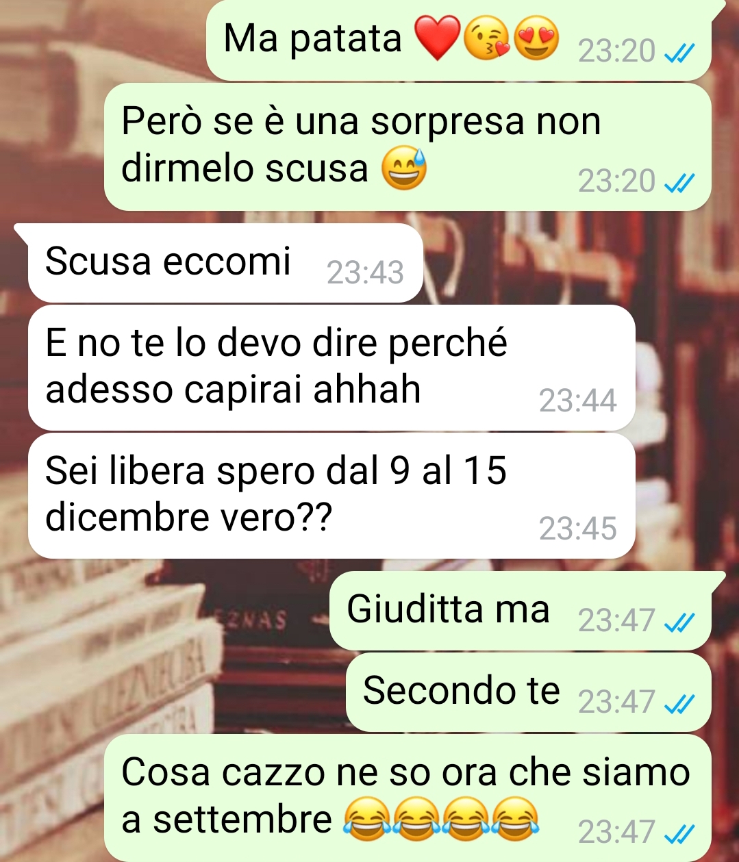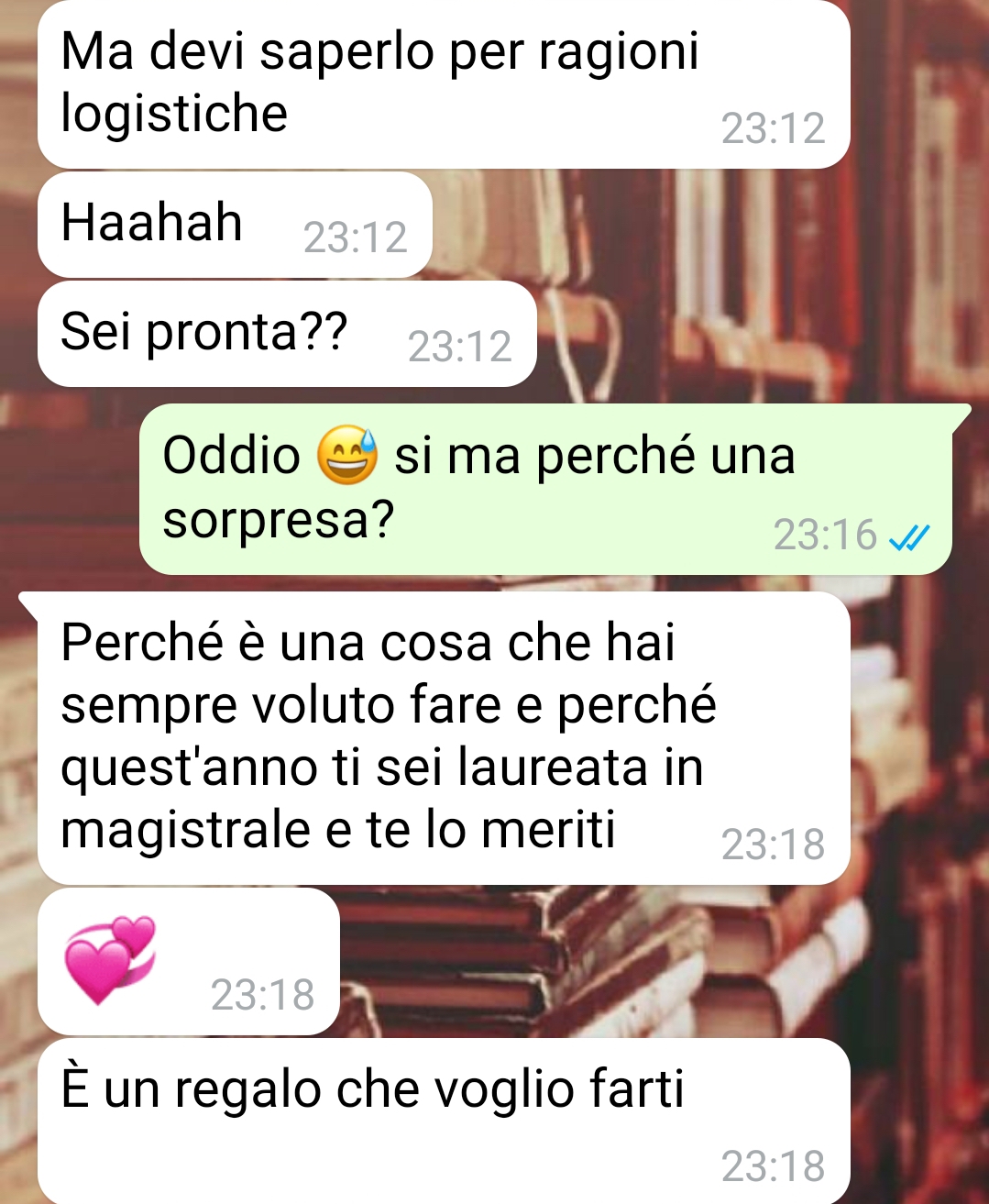 Mi chiamo Desirè , quest’anno mi sono laureata in magistrale e sinceramente non pensavo di farcela, ma eccomi qui! Laureata! La mia migliore amica Giuditta, soprannominata Titta, (nella chat troverete un altro nuovo soprannome che le ho dato, in seguito alla conversazione e prima di inviarvi il tutto, ma lo lascio scoprire a voi, non vi spoilero nulla) ha deciso di farmi una sor presa, che però non lo è più stata perché mi ha detto tutto. Doveva essere una cosa carina, una bella sorpresa, un bel momento per entrambe, ma la sorpresa me l’ha fatta alla fine, quando ho scoperto una cosa che non mi ha fatto arrabbiare, di più!!! Ma secondo voi si può? Dopo anni di amicizia, io mi aspetto un comportamento completamente diverso! Non sono una bambina, ma credetemi, mi ha fatto davvero male. Ora io non so se ho reagito bene o male, aiutatemi a capirlo, ma lì per lì mi sono sentita tradita! Spero che mi diciate voi che cosa avreste fatto se foste stati nella mia situazione o se vi è già capitata una situazione simile. Se lo farete, grazie mille in anticipo…