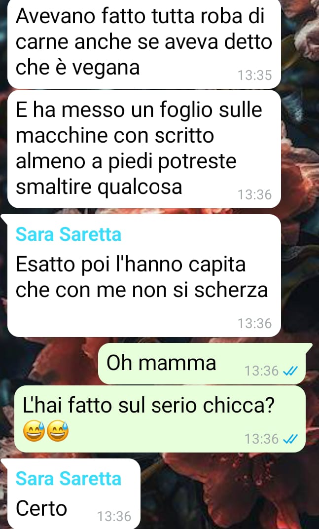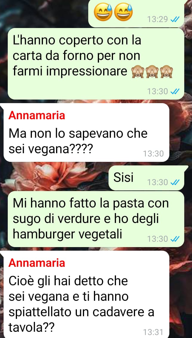 Vegana da circa sei anni, spiega di non essere una persona che cerca di imporre le proprie idee agli altri, eppure racconta che, dopo la sua scelta, ha visto allontanarsi molte delle persone che considerava amiche. Ammette di essere una persona timida, e proprio per questo, quando le persone hanno iniziato a sparire dalla sua vita, non ha cercato scontri, ma ha accettato con amarezza la situazione, consolandosi con l’idea che, se si erano allontanate per questo motivo, non fossero vere amicizie.