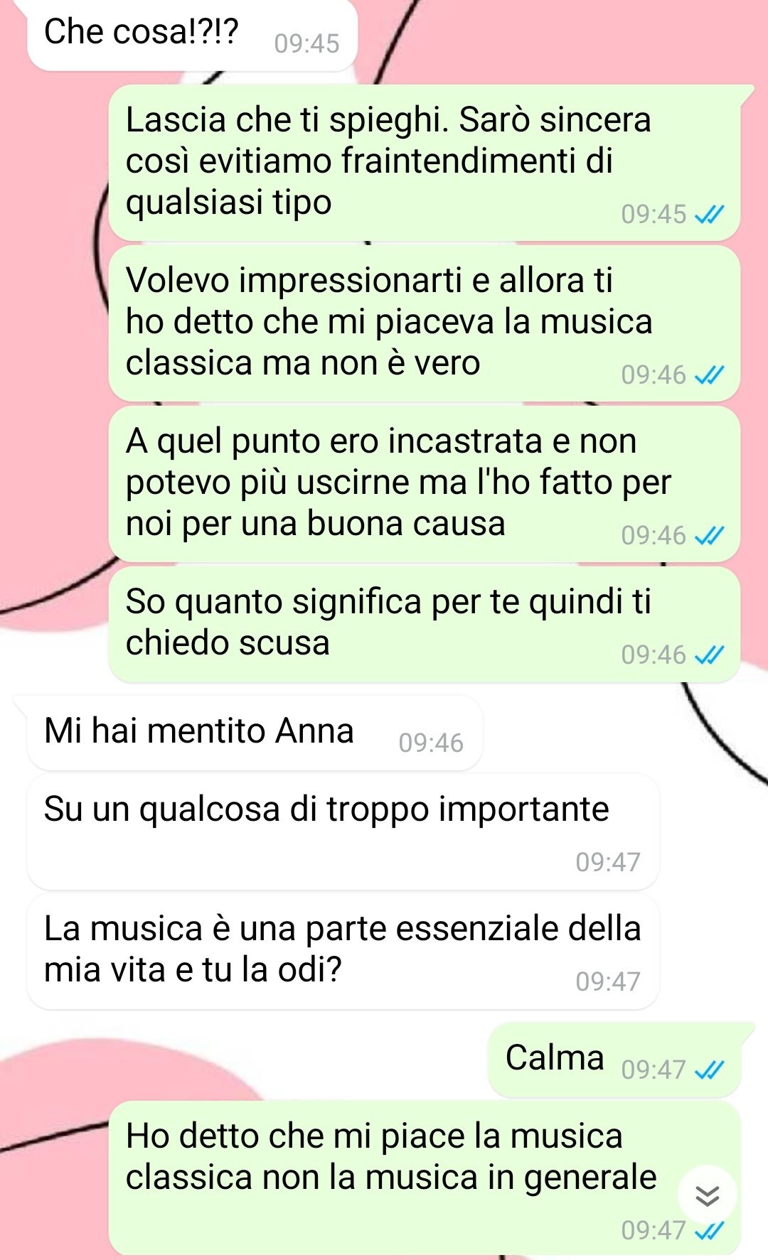 Io e Luca ci siamo conosciuti per caso, una sera d’inverno, a un concerto di musica classica. Una mia amica mi aveva trascinata controvoglia, e io, che di solito ascolto tutt’altro, ero completamente fuori posto. Durante l’intervallo, però, ci siamo incrociati e abbiamo iniziato a parlare, e ho scoperto che lui faceva il pianista classico di professione. Lui era così appassionato, così coinvolto dalla musica, che non ho avuto il coraggio di dirgli che per me era stato un vero strazio. Così, quando mi ha chiesto se mi piaceva la musica classica, ho mentito. Ho detto che la amavo. Era solo una piccola bugia, pensavo. Da quella sera, abbiamo iniziato a frequentarci. Luca mi faceva sentire speciale, con lui ogni momento era magico. I nostri primi mesi insieme sono stati splendidi: passeggiate al parco, cene a lume di candela, serate passate a parlare di sogni e progetti. Lui mi dedicava pezzi al pianoforte e io sorridevo, fingendo di riconoscere ogni nota. Per lui, avrei fatto qualsiasi cosa. Un giorno, però, ha usato il mio secondo telefono per cercare una canzone da dedicarmi e ha scoperto le mie playlist su Spotify. Quel momento ha fatto crollare tutto.