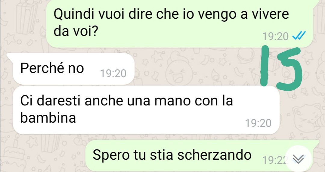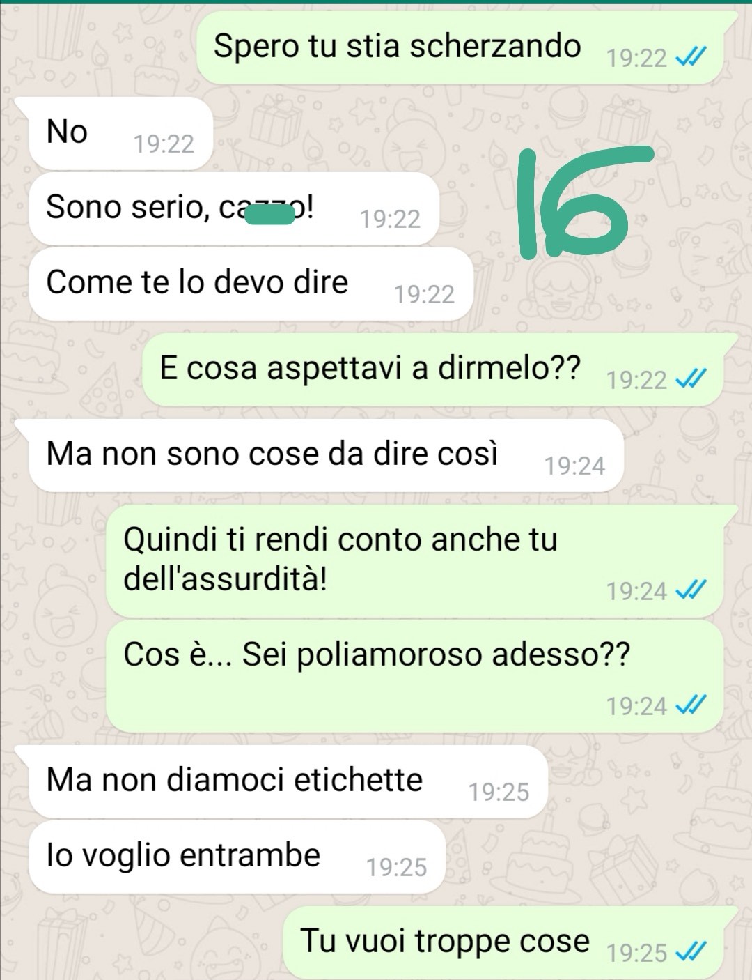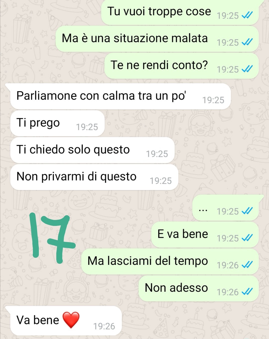 Nonostante ciò, la nostra amica riconosce che, alla sua età, non sarebbe stata in grado di offrire a Luca ciò che lui desiderava: una famiglia. Luca, infatti, ha continuato la sua relazione ufficiale con la fidanzata, e la nostra fan è diventata l’amante. La situazione è cambiata ulteriormente quando un giorno Luca le ha confidato che la sua fidanzata era incinta e che presto avrebbero avuto un figlio. A quel punto, la nostra amica ha cominciato a pensare che la loro relazione fosse giunta alla fine. La chat che condivide riguarda il giorno in cui è nata la figlia di Luca. Lei era convinta che quello fosse il momento in cui tutto si sarebbe concluso. Invece, Luca le ha fatto una proposta inaspettata, che l’ha lasciata senza parole. La nostra fan si trova ora in una situazione di grande confusione e non sa cosa fare. Attraverso l’anonimato di questa pagina, spera di ricevere consigli, poiché non può confidarsi con nessuno. Nessuno, infatti, è a conoscenza della verità sulla sua relazione con Luca.