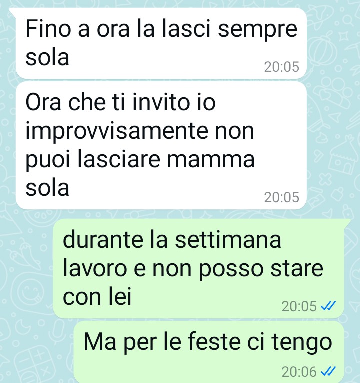 La nostra fan racconta di essere stata invitata dalla suocera insieme al marito per trascorrere la festa dell’Immacolata a casa sua. Tuttavia, l’invito non includeva sua madre, una circostanza che ha creato immediato disagio alla follower. Essendo figlia unica e avendo perso il padre tempo fa, la donna si trova ad avere come unico familiare rimasto proprio sua madre, rendendo la situazione particolarmente delicata dal punto di vista emotivo.