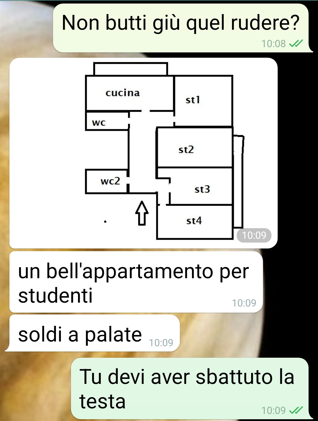Ecco qua. Gli screen del -mega imprenditore architetto figo- Solo io potevo avere il Berlusca, Piano e Brad Pitt tutto in uno. Che donna fortunata! Il mio geniale amore ha pensato bene di trasformare quel rudere che ha ereditato da un suo zio senza figli in una fabbrica di soldi. Una spettacolare casa per studenti, ha pure elaborato la ristrutturazione e la suddivisione. Ma io ho riscontrato qualche intoppo. E anche sull’idea del B&B ci sono problemi. Non vi dico poi come ha pensato di risolvere il problema delle spese di ristrutturazione… altro che imprenditore geniale… Va bon ho detto anche troppo.