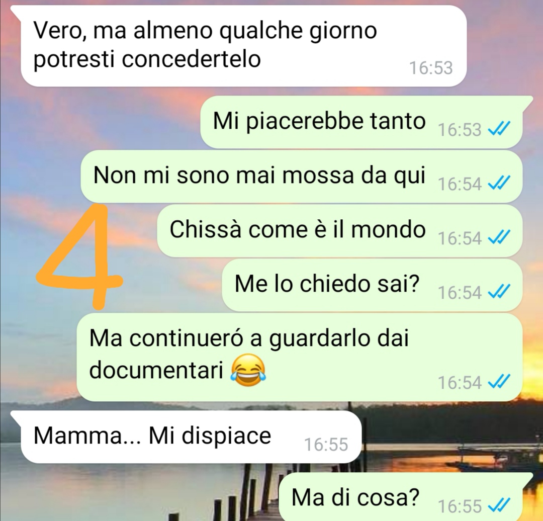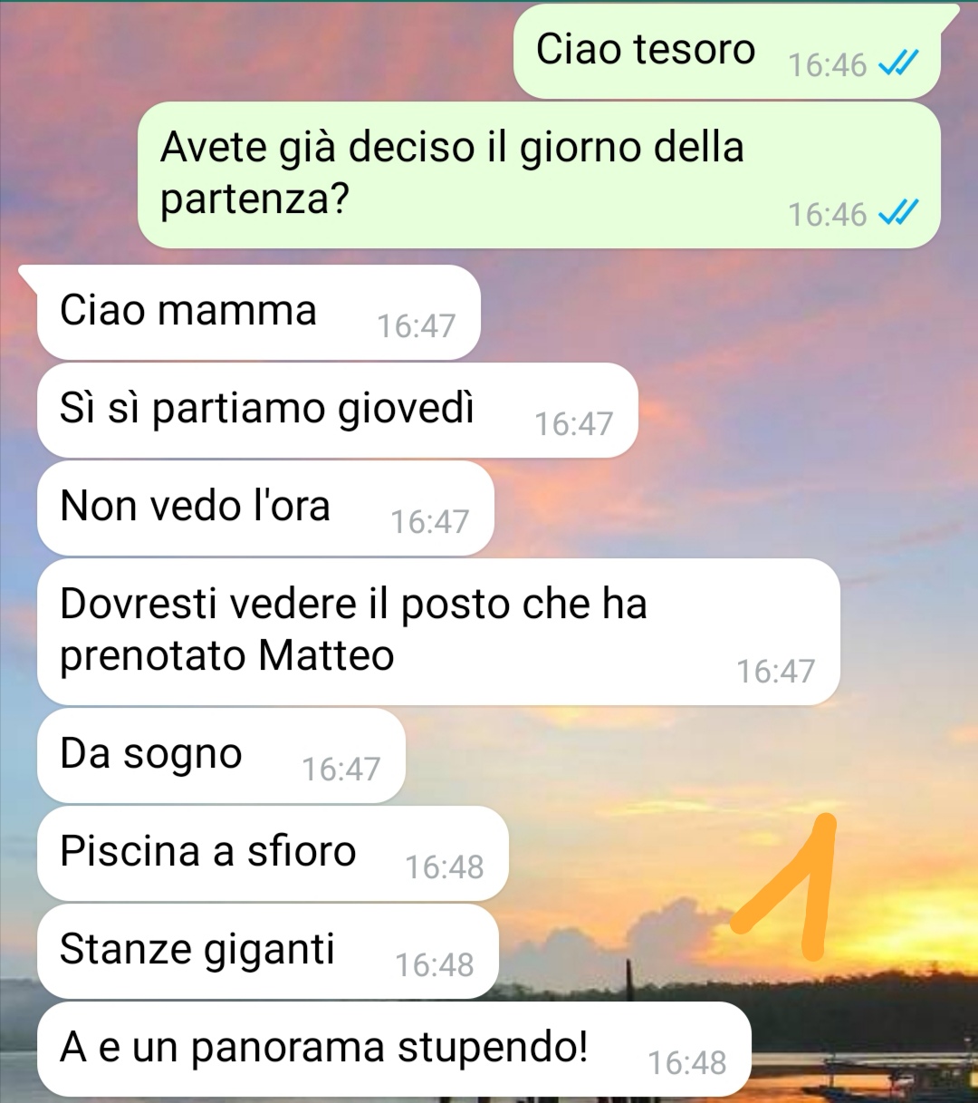 Ciao, mi chiamo Ada e sono mamma di una ragazza ormai grande, che ho avuto quando avevo appena 17 anni. Il suo papà se ne è andato quando aveva due anni, una vita troppo difficile per un ragazzo ancora giovane. Io non sono nata nell’agio, i miei hanno sempre lavorato ma si faceva fatica ad arrivare a fine mese. Quando hanno scoperto che aspettavo una bambina… non vi dico cos’è successo, ma comunque mi sono rimboccata le maniche, mi sono messa a fare le pulizie e ho cresciuto una ragazza in gamba da sola. Lei ha potuto studiare, trovare un lavoro e da qualche anno ha trovato anche un ragazzo d’oro, Matteo, che non le fa mancare niente. Convivono da poco a casa di lui e quest’estate sarebbero partiti per una vacanza da sogno. Infatti questa chat risale a quando ho scritto a mia figlia per sapere il giorno della partenza. Ogni volta che vanno via, io vado a casa loro e mi offro di fare qualche lavoro, stirare, fare una lavatrice, cose così. Io non contribuisco mai economicamente, e cerco di aiutarli così. Quindi dico a mia figlia di lasciarmi una lista con le cose da fare che poi sarei passata da casa e l’avrei vista. Ma poco dopo la mia proposta lei mi scrive una cosa che mi lascia senza parole… letteralmente!
