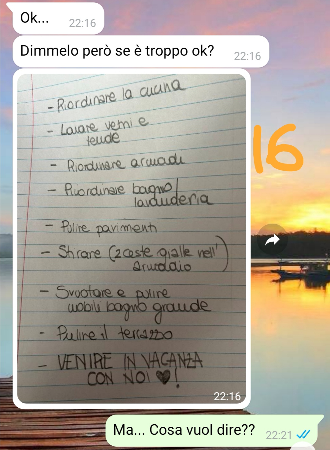 Anche questa volta, scrive alla figlia per sapere quando partiranno e si offre – come sempre – di dare una mano con le faccende domestiche in loro assenza. Le chiede di lasciarle una lista con le cose da fare, così avrebbe approfittato dell’occasione anche per vederla un po’ prima della partenza.