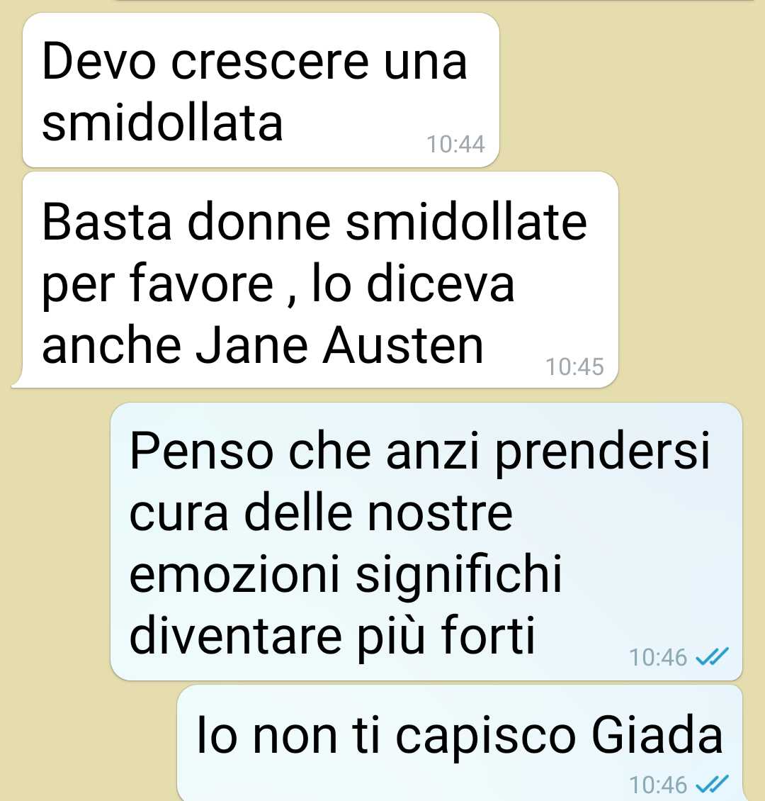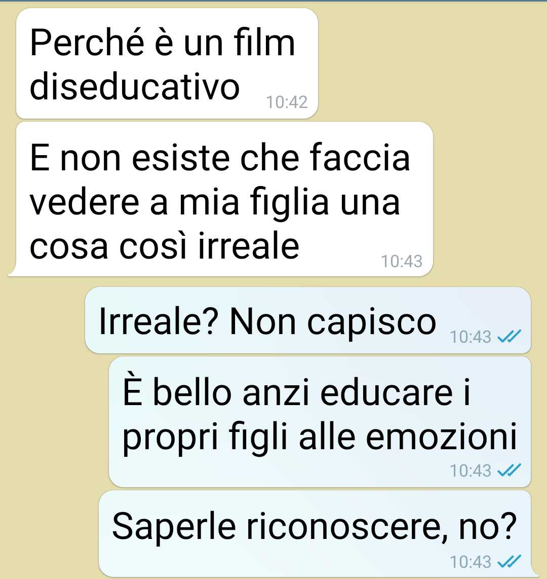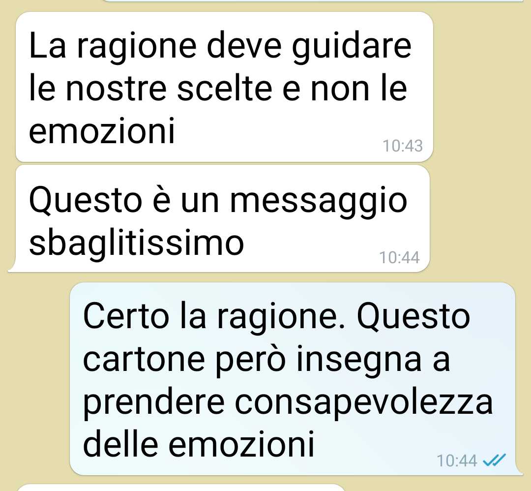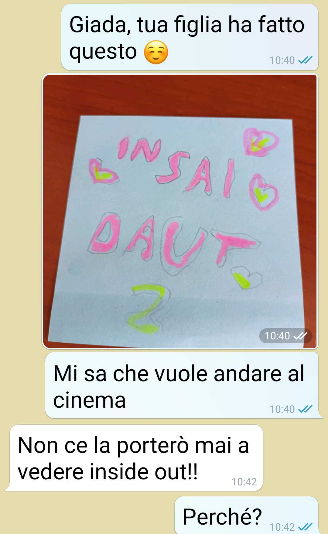 Mia cognata non vuole fare vedere a sua figlia Inside out. Lei ha una storia dolorosa alle spalle che non riesce a superare. Mia cognata ha lasciato sua figlia a casa mia l’altro giorno perché era a lavoro. La bambina ha fatto un disegno spontaneamente senza che ovviamente fossi io a chiederle di farlo. In un foglietto di carta azzurro ha scritto a suo modo inside out circondato da tanti cuori. Mi ha commossa tanto. Era un disegno così genuino e semplice. Così ci ho fatto una foto e l’ho mandata a sua madre. Mi ero immaginata che a mia cognata facesse piacere ricevere un disegno di sua figlia e che fosse d’accordo nel portare sua figlia al cinema a vedere quel film che tutti dicono essere bellissimo. Invece mi ha risposto abbastanza male. Lei ha una storia molto brutta. Ha vissuto un vero e proprio trauma che non credo sia riuscita ancora ad elaborare dalle sue parole. Sta ancora soffrendo molto e mi dispiace che riversi tutto questo sulla bambina. Sarebbe bello che ognuno di noi provasse a curare le sue ferite, a leccarle un po’ come fanno i gatti che si lisciano il pelo… ma.. non è sempre facile.