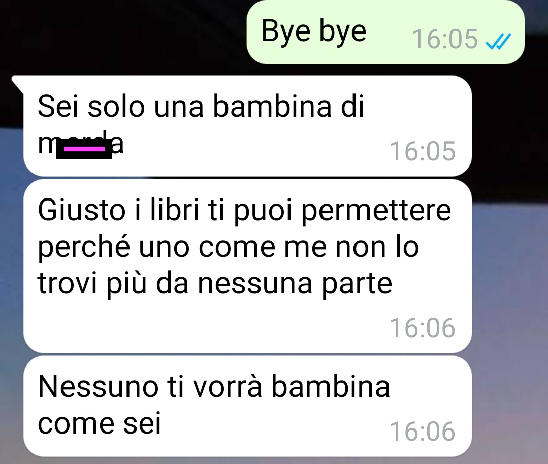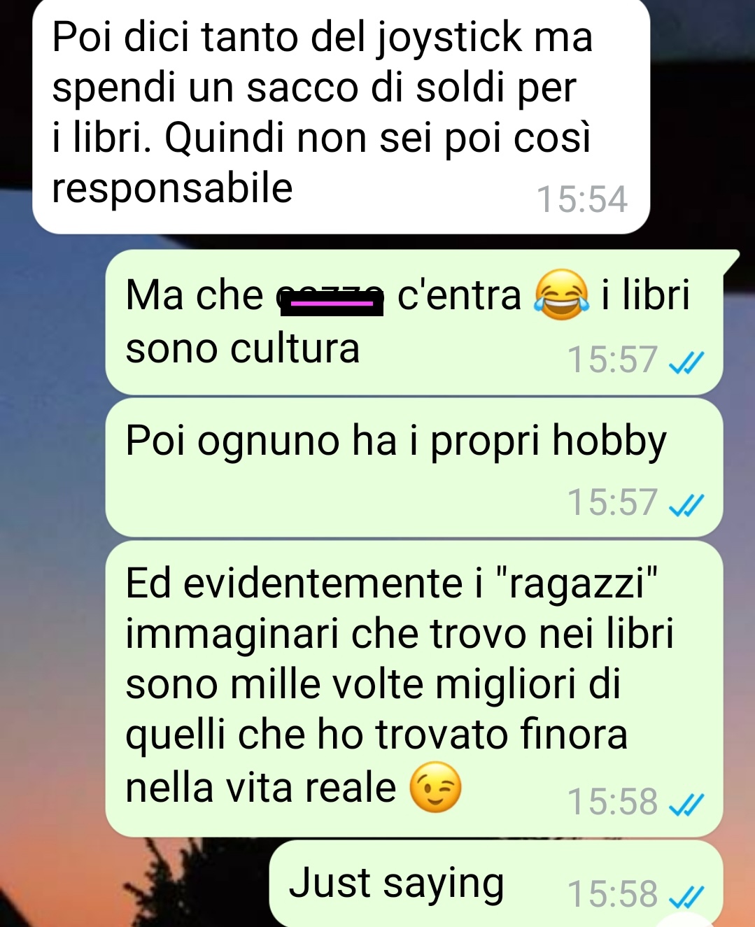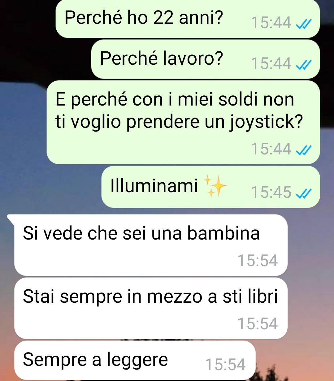 Chiara lavora da due anni, è indipendente, e ama dedicare parte dei propri guadagni ai piccoli piaceri della vita, in particolare alla sua più grande passione: i libri. Una passione che coltiva con entusiasmo, e che fa parte della sua identità. Proprio attorno a questo dettaglio si è consumata la discussione che l’ha spinta a condividere la chat.