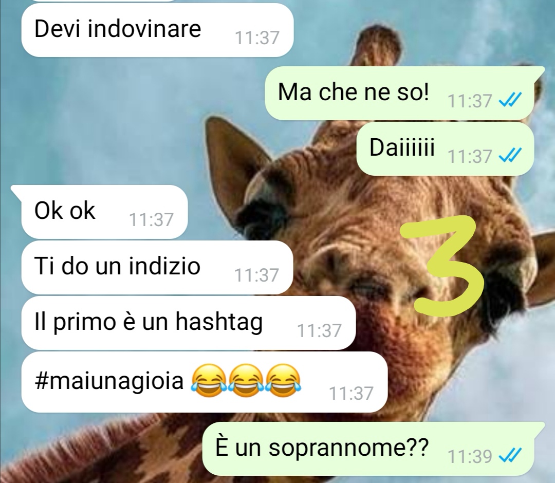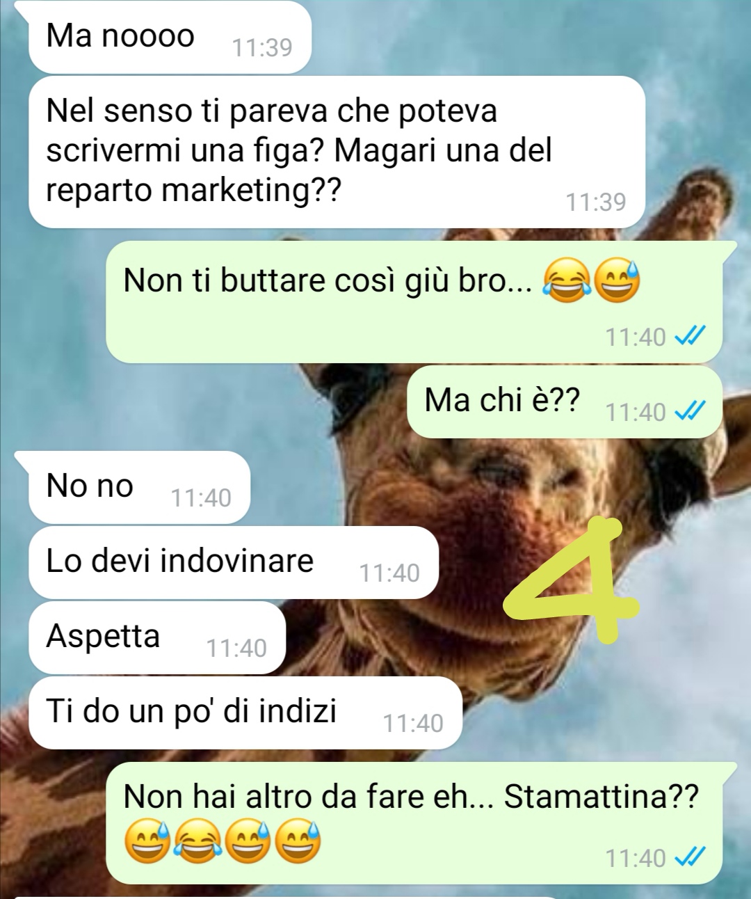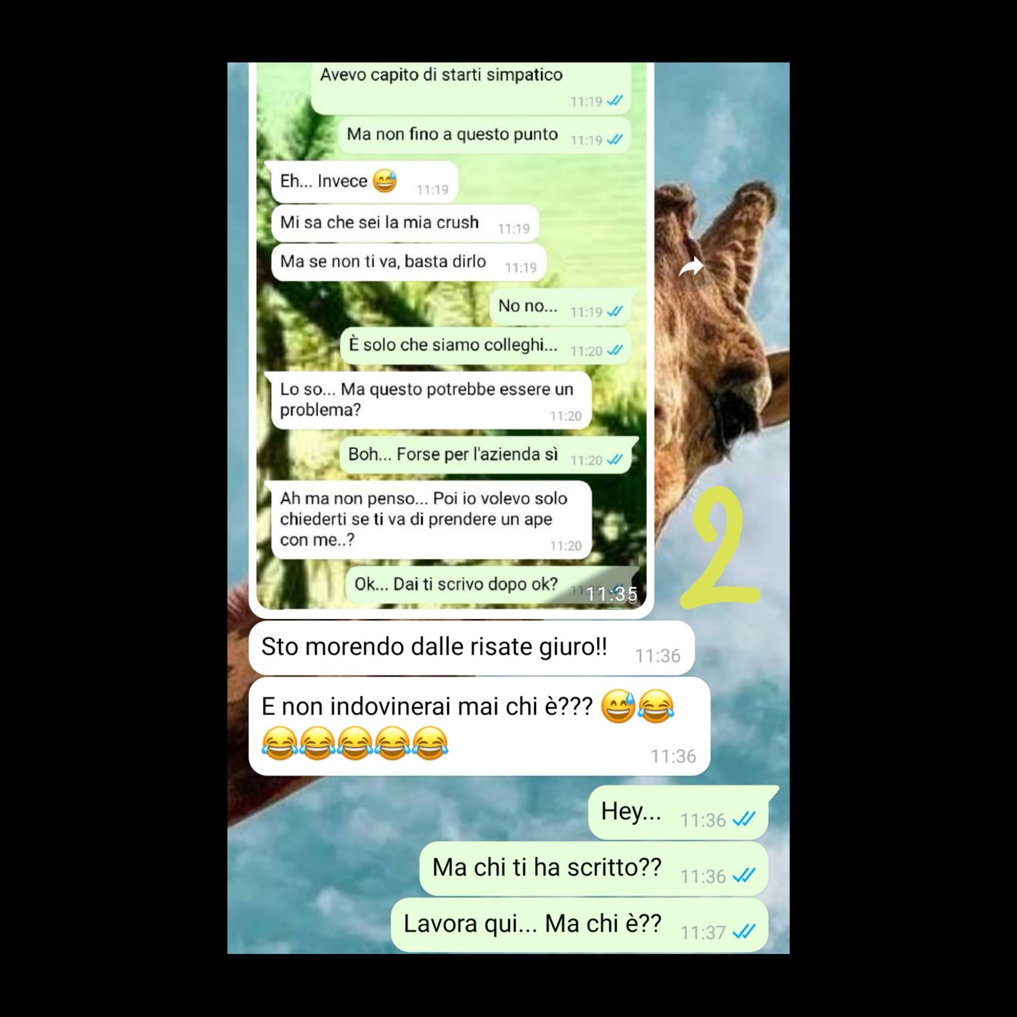 La chat che sto per inviare è avvenuta con un mio collega che lavora nella mia stessa azienda relativamente da poco. Nella nostra azienda ultimamente c’è un bel turnover, hanno preso un po’ di persone nuove tra cui appunto lui, che è un tipo simpatico, alla mano, sembra uno di quelli capaci di mettere a proprio agio chiunque. L’altra mattina però mi manda un messaggio e mi dice che deve raccontarmi assolutamente una cosa. Anzi comincia con il mandare uno screen di una conversazione avvenuta poco prima. Sembra che io debba indovinare con chi è avvenuta questa conversazione…e soprattutto chi è la donna misteriosa che ha scritto ciò che leggerete nella chat. Allora comincia una sorta di Indovina Chi, avete presente il famoso gioco di identità? E lui mi fornisce una serie di indizi per farmi capire chi sia…ma è proprio mentre lui cerca di farmi indovinare la misteriosa identità della ragazza, che finisce per svelare molto su di sé. Non aggiungo altro e vi lascio scoprire tutto tramite gli screen che vi invio. Leggete fino alla fine, per favore.