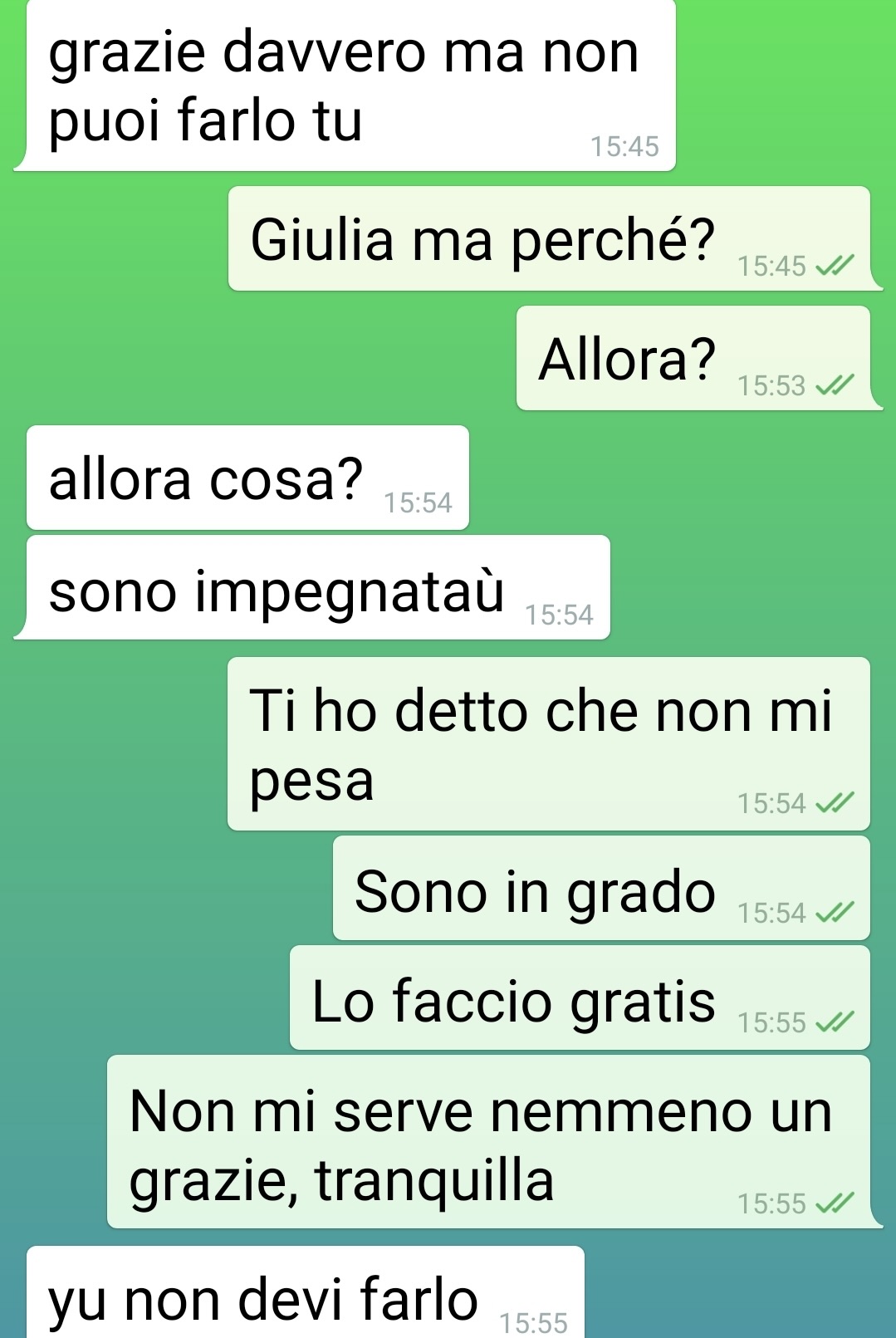 La vicenda riguarda la sua fidanzata, Giulia, e una situazione che coinvolge la sorella di lei, Luciana, la quale ha bisogno di medicazioni domiciliari post-intervento. Il nostro follower si è offerto con disponibilità totale: niente compenso, massima attenzione, spiegazioni dettagliate. Nonostante ciò, Giulia ha continuato a rifiutare l’aiuto, dichiarando che non era il caso che fosse lui a occuparsene.
