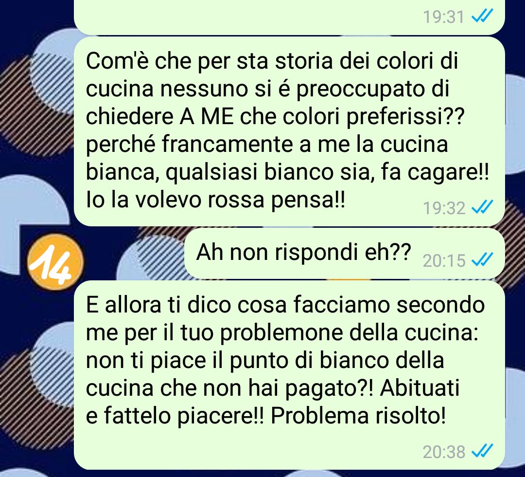 Lina non capisce se sua moglie si renda conto di quanto stanno facendo per risparmiare, di quanto amore ci sia dietro ogni scelta, anche dietro la cucina “regalata”, che magari non è di design perfetto, ma funzionale e bella per quello che offre. Lei sente che le critiche non sono costruttive, ma pesanti, come se nulla fosse mai abbastanza per la moglie.