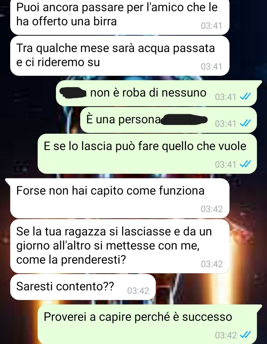 Alla luce delle sue esperienze passate, non tutte positive, ora si trova in un momento di incertezza riguardo a questa nuova potenziale relazione. La sua principale preoccupazione ora è se dovrebbe dare priorità al valore dell’amicizia mantenendo i legami con il suo amico, oppure se dovrebbe seguire i suoi sentimenti verso la donna che ha catturato il suo interesse.