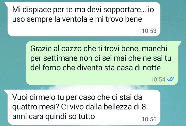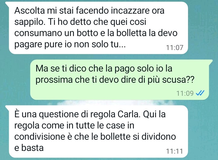 Nel racconto, la nostra amica spiega però che recentemente la coinquilina è rientrata dopo un periodo di assenza. Proprio in questa occasione, secondo quanto riferisce Carla, si è verificato un episodio che ha acceso una lite tra le due. La nostra fan racconta che la discussione è avvenuta tramite chat e che la coinquilina si è permessa di dirle cose che lei ha trovato fuori luogo e inappropriate.