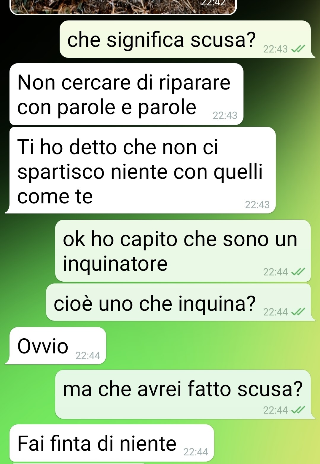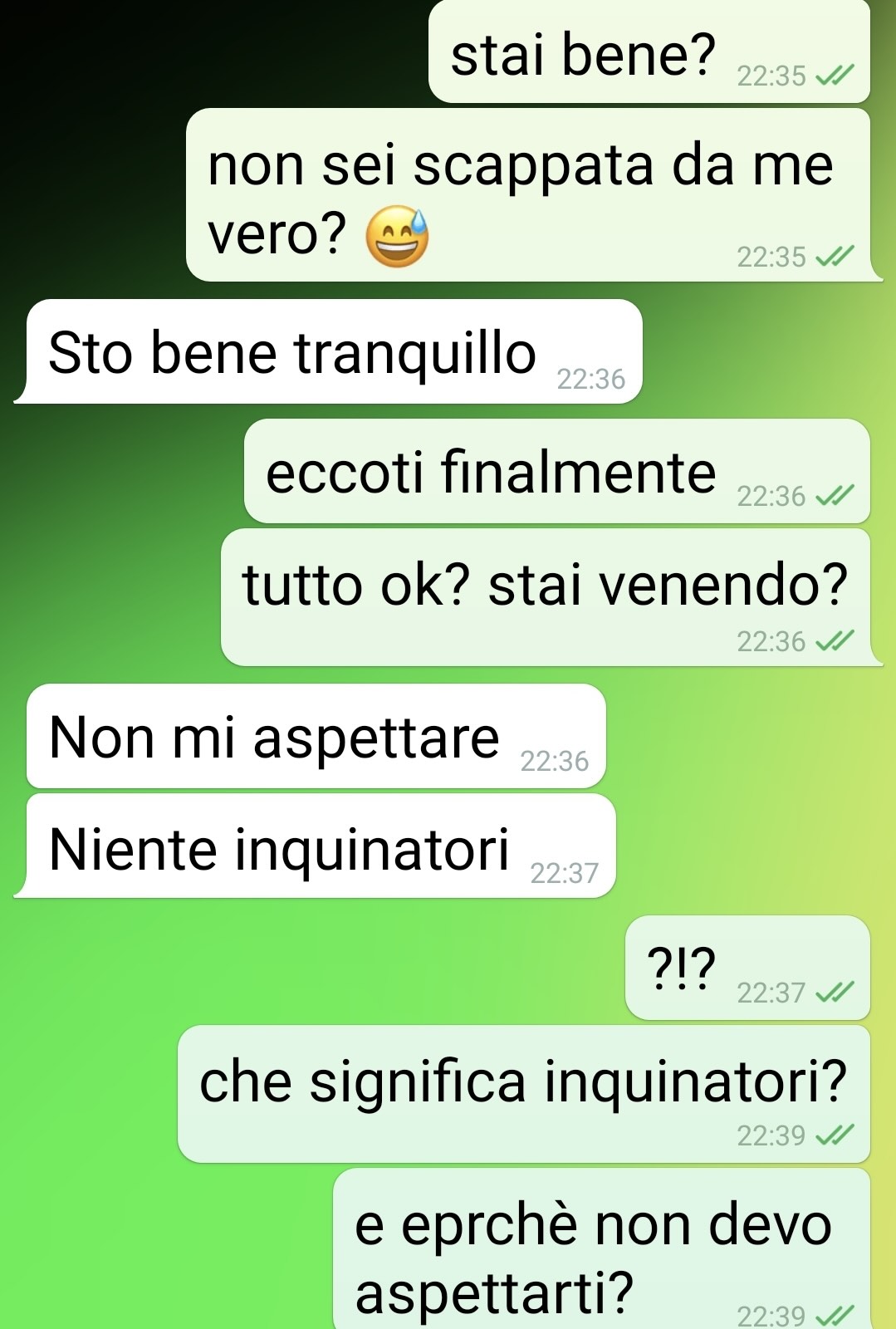 La ragazza con cui avevo un appuntamento mi ha mollato su due piedi perché sarei un “inquinatore”. Io dico che è lei ad avere il cervello inquinato! Alla fine anche io finisco sulla vostra pagina. Era inevitabile prima o poi. Usando app per incontri qualche spostata di testa ti deve capitare. La legge dei grandi numeri…nel mio caso si chiama Martina e ieri sera abbiamo avuto il primo (e ultimo) appuntamento. E dire che sembrava normale, sia nelle chat di prima che soprattutto nella serata. Ero davvero contento. Partiti con un gelato, abbiamo proseguito con la cena e pure con il post, un bell’ after con cocktail. E qui però sono venuti fuori gli altarini. Mi allontano per gettare i bicchieri di plastica e lei scompare. Mi ha mollato perché avrei inquinato madre terra. Sapete come? Tenetevi forte… ho buttato il ghiaccio per terra. Avete letto bene: ghiaccio. Avrei inquinato con l’acqua! Beccatevi questa chat surreale, io mi sa che vado a disinstallare Tinder.