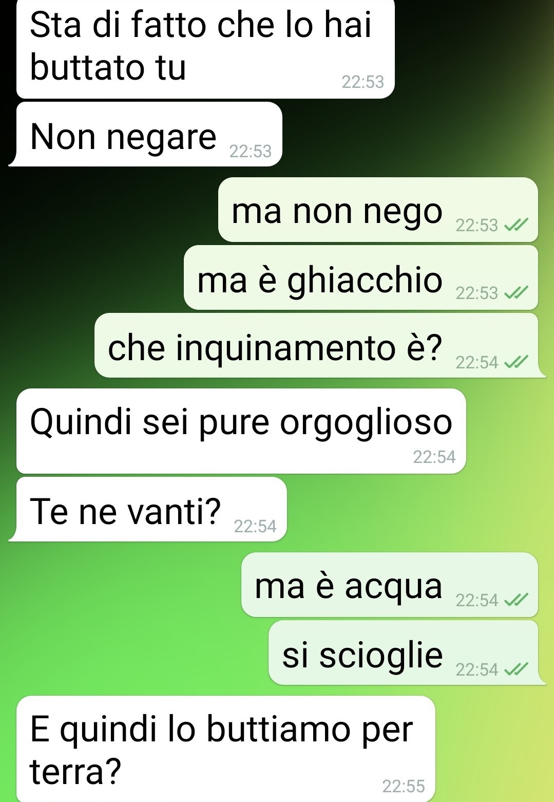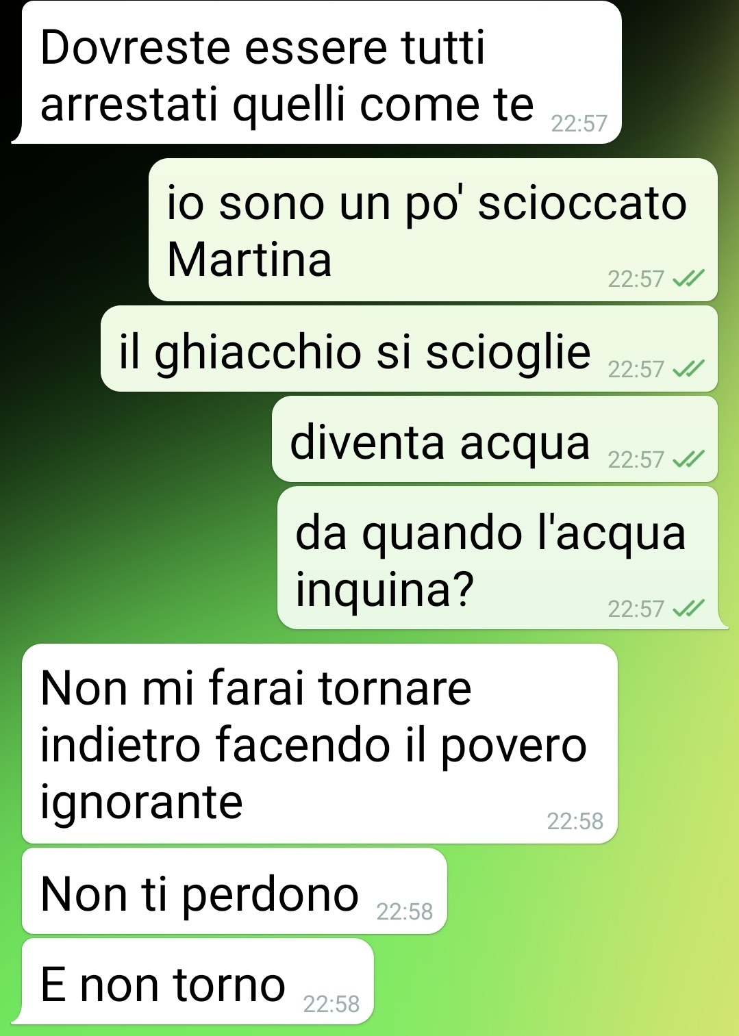 Martina, infatti, è scomparsa senza dire nulla. Poco dopo, tramite messaggi, gli ha fatto sapere di averlo lasciato lì perché, a suo dire, aveva “inquinato madre terra”. Il motivo? Aver gettato il ghiaccio per terra. Sì, proprio l’acqua ghiacciata, che avrebbe rappresentato, secondo lei, un atto intollerabile contro l’ambiente.
