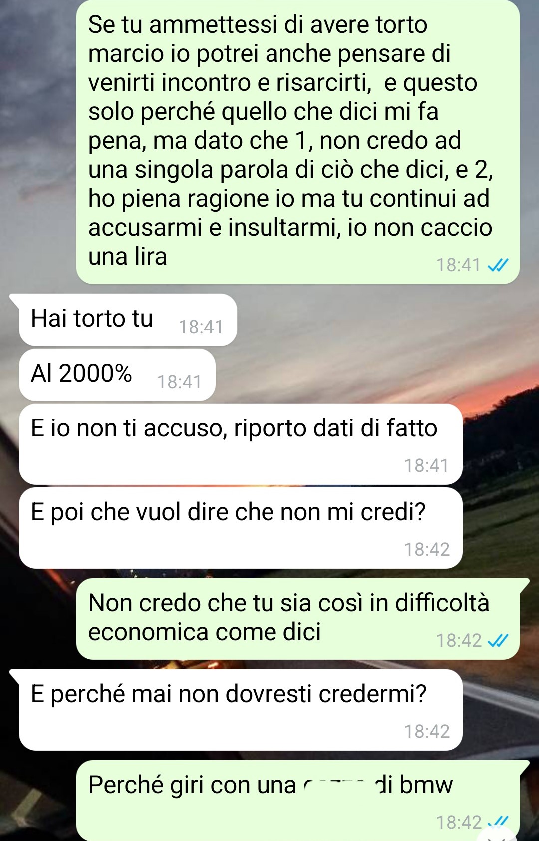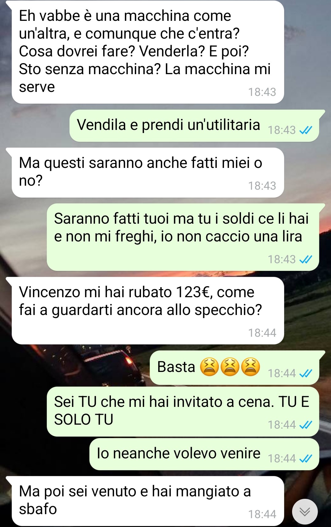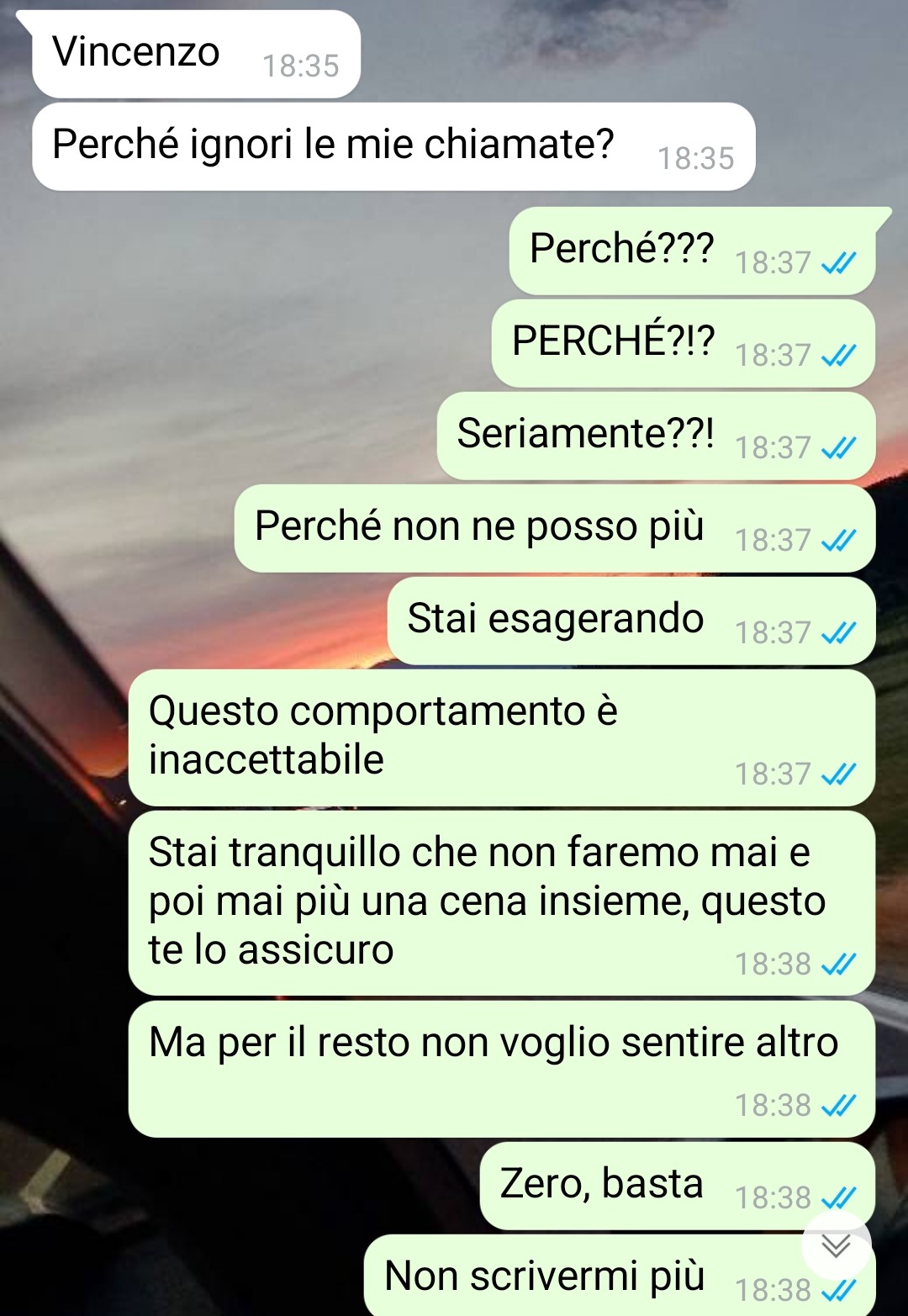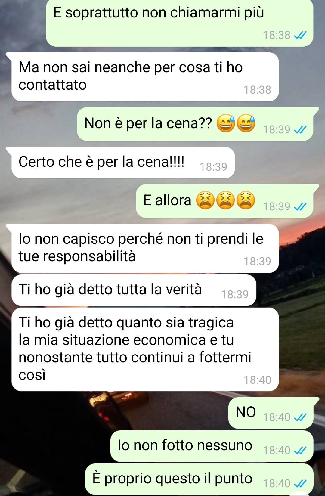 Sono ancora molto traumatizzato da quanto è successo e non so bene che fare, non so se passare alle maniere forti, non so se dimenticare tutto o altro, ma di certo devo fare qualcosa. Mi chiamo Federico, sono un giovane padre divorziato, con un pessimo rapporto con l’ex moglie ma un fantastico rapporto con la figlia, con un lavoro umile e normale e con, almeno pensavo, dei colleghi rispettabili e pacati. In realtà mi sbagliavo, di grosso. Circa due settimane fa sono andato a cena con Federico, questo mio collega che non conosco neanche così tanto bene o comunque non lo considero mio amico. Lui mi invita a cena, tra l’altro in un gran posto, e dato che lui voleva parlarmi di lavoro in privato e dato che appunto ero suo ospite in questo gran ristorante, ho deciso di andare. Ho mangiato bene e speso tanto e alla fine lui si voleva rifiutare di pagare nonostante l’invito. Ho insistito e com’era giusto ha pagato. Solo che dal giorno dopo e per tutti i giorni a seguire ha continuato a scrivermi e pressarmi per riavere i suoi soldi in maniera inaccettabile. Il problema è però giunto quando ha fatto una cosa davvero terribile.