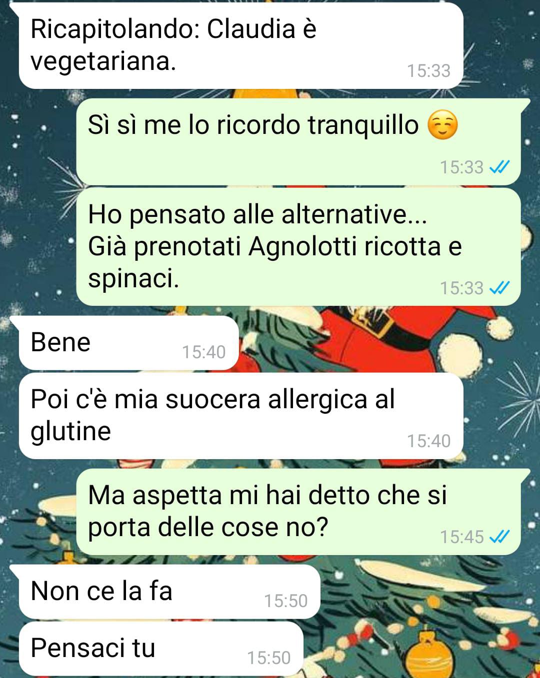 I miei pranzi di Natale sono “famosi” perché molto apprezzati. È un lavoraccio dal quale non mi sono mai tirata indietro.Ma ultimamente le cose sono diventate troppo complesse, anche per me che mi piace cucinare.Adesso, mio figlio mi ha chiesto di invitare anche i genitori della sua ragazza Claudia, la sorella (con prole) e il fratello di Claudia… insomma tutta la famiglia oltre alla nostra (siamo tanti anche noi).