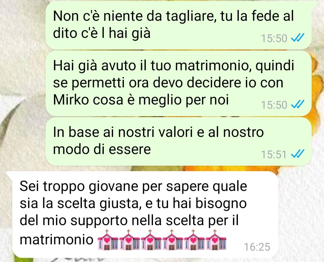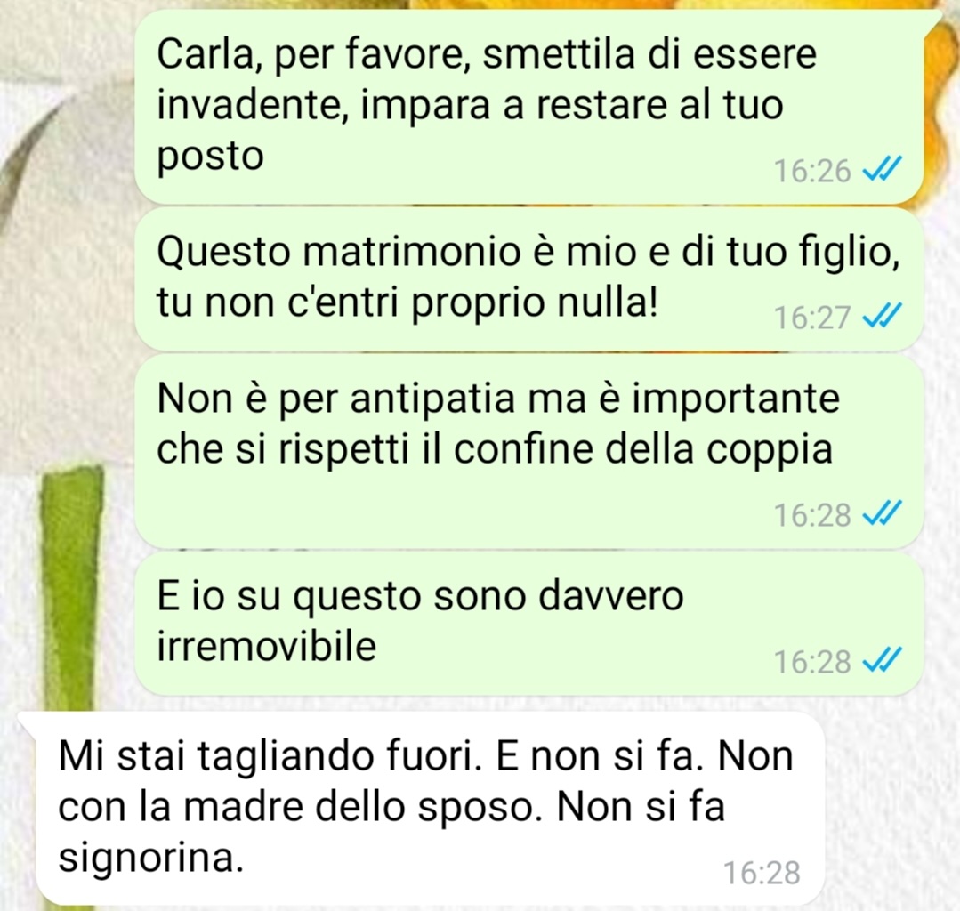 Nel suo racconto, la nostra follower spiega che, proprio per questo motivo, ha deciso di intervenire. Ha cercato in tutti i modi di far comprendere alla suocera quali fossero i limiti e quali le scelte già stabilite dagli sposi. Secondo quanto riferisce, il suo obiettivo non era creare conflitti, ma riaffermare il fatto che il matrimonio riguarda prima di tutto lei e Mirko. La nostra fan descrive questo tentativo come un modo per “rimetterla al suo posto”, nel senso di chiarire i ruoli e le competenze di ciascuno.