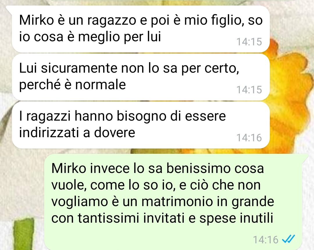 La nostra amica conclude il suo racconto spiegando che per lei il rispetto deve essere reciproco e che le decisioni degli sposi dovrebbero essere riconosciute come centrali. Il desiderio di un matrimonio semplice rimane per lei e per Mirko un punto fermo, nonostante le difficoltà incontrate nel rapporto con la futura suocera.