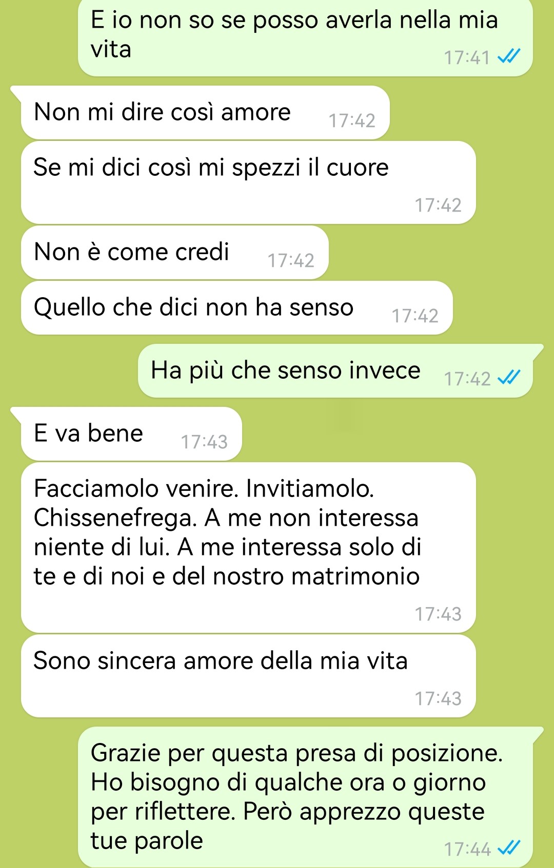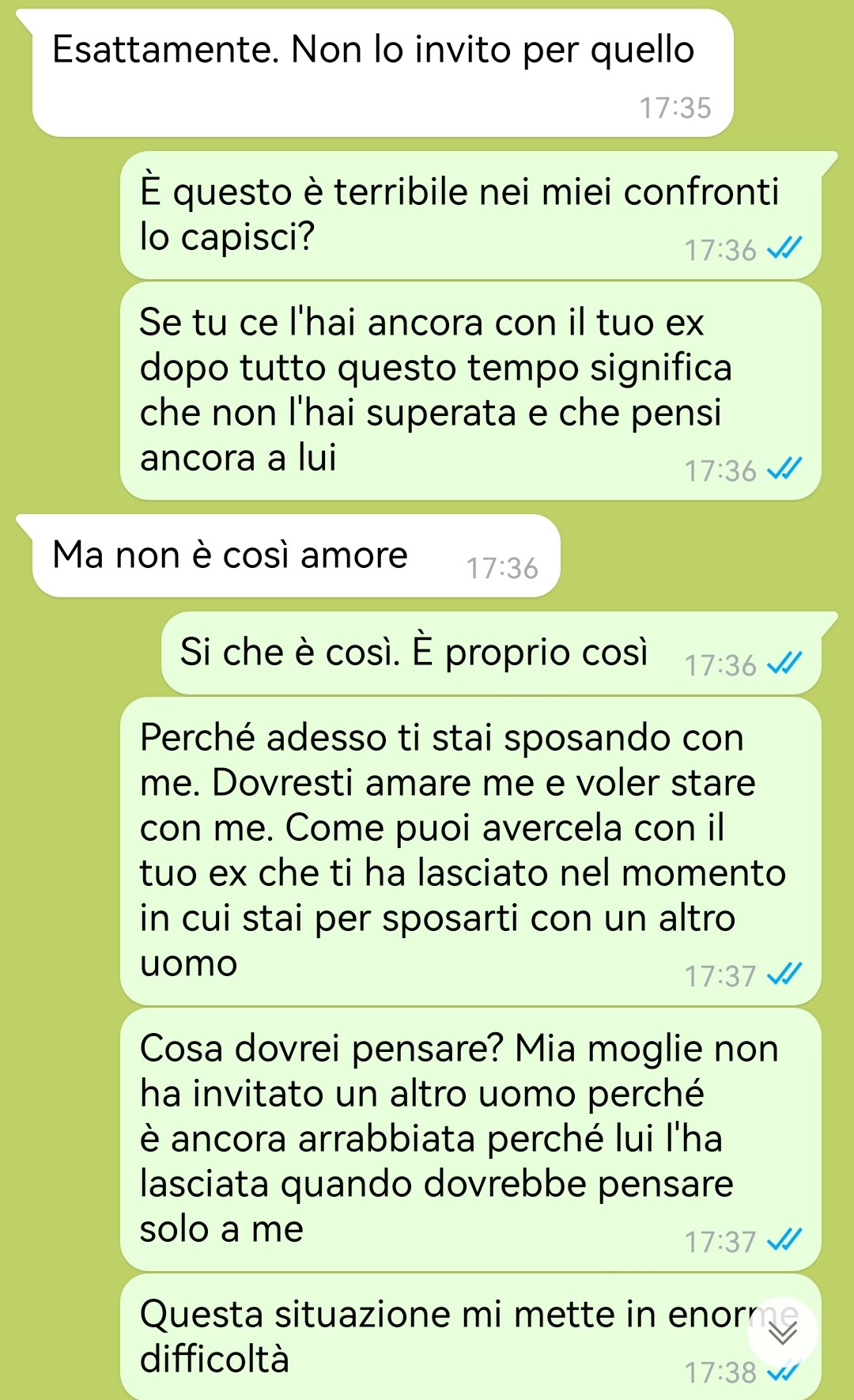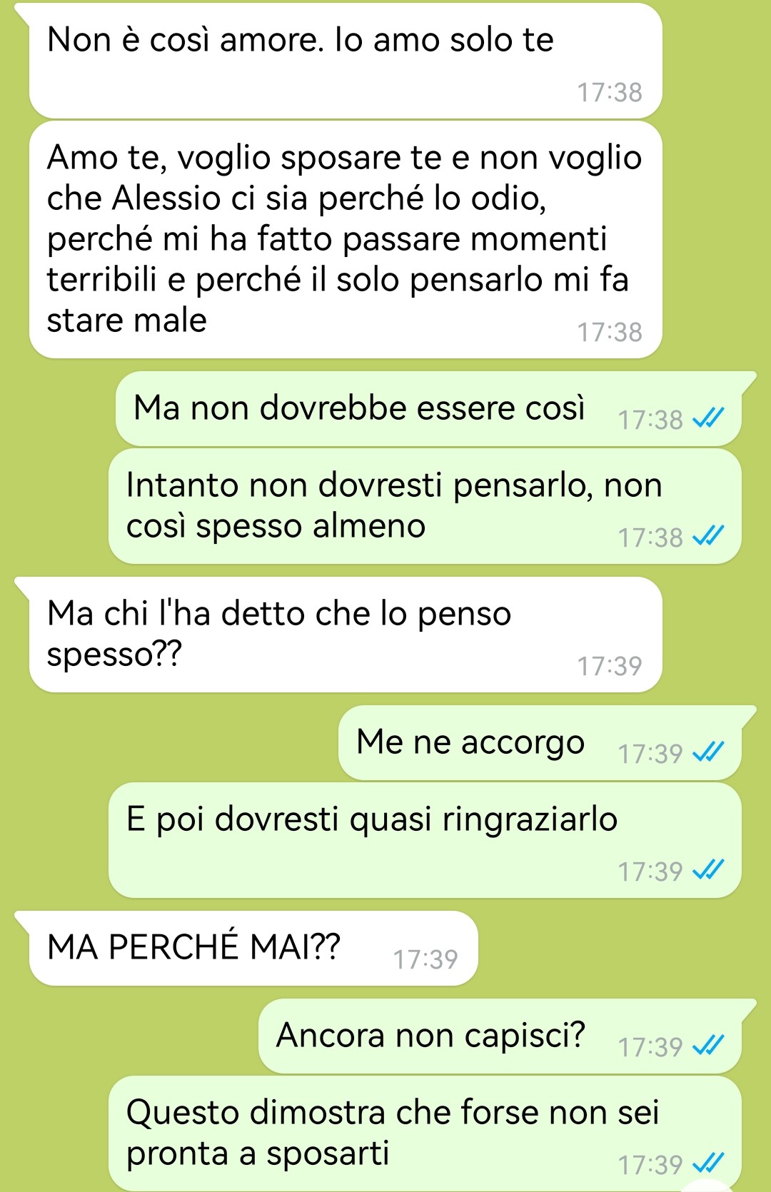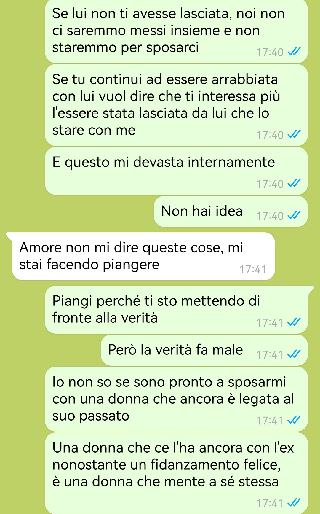 Non entra nei dettagli immediati di cosa sia successo, ma lascia intendere che quel nome non solo era presente nella lista, ma che la questione ha scatenato un confronto acceso e inaspettato. Una scoperta che ha messo in discussione le basi della fiducia tra loro, tanto che ora parla della sua “futura moglie” con il dubbio che quel futuro sia ancora certo.