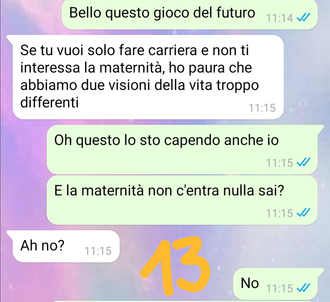 Decide di non affrontare subito l’argomento quella sera, ma la notte passa insonne, tormentata dai pensieri. La mattina seguente, approfittando della pausa caffè che solitamente condividono in ufficio, decide di scrivergli per capire se è il momento giusto per parlare. È a quel punto che qualcosa di totalmente inaspettato la travolge.
