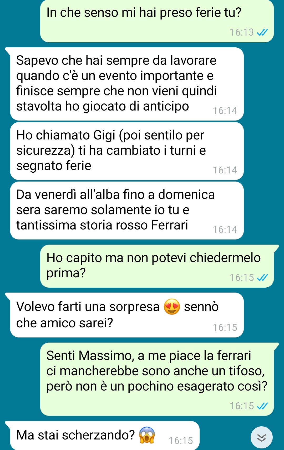Quello che mi è capitato è assurdo ma dato che alla fine la questione si è chiusa abbastanza bene (per così dire, ma anche no) ho deciso di condividere quanto successo tra me, il mio migliore amico Massimo e mia sorella Michela. Io e Massimo siamo sicuramente molto legati, su questo non ci sono dubbi, e lo considero realmente il mio migliore amico, solo che spesso risulta essere un po’ “pesante”. Quando si fissa su qualcosa, infatti, non parla d’altro, organizza cose, prende iniziative non richieste e cerca anche di coinvolgerti in tutto e per tutto. Non lo fa con cattiveria, lui pensa davvero che tutti abbiano il suo stesso entusiasmo verso certe cose, ma no…non è mai così. L’altro giorno ero bello tranquillo casa che progettavo di come godermi il fine settimana (anche se era appena lunedì) e Massimo mi scrive proponendomi quella che per lui era una sorpresona meravigliosa ed incredibile. Spoiler: non la era, sarebbe stato un inferno in terra se fatta con lui. Dovevo uscirne ed ero disposto a tutto, infatti, almeno in teoria, entrerà poi in soccorso mia sorella Michela.