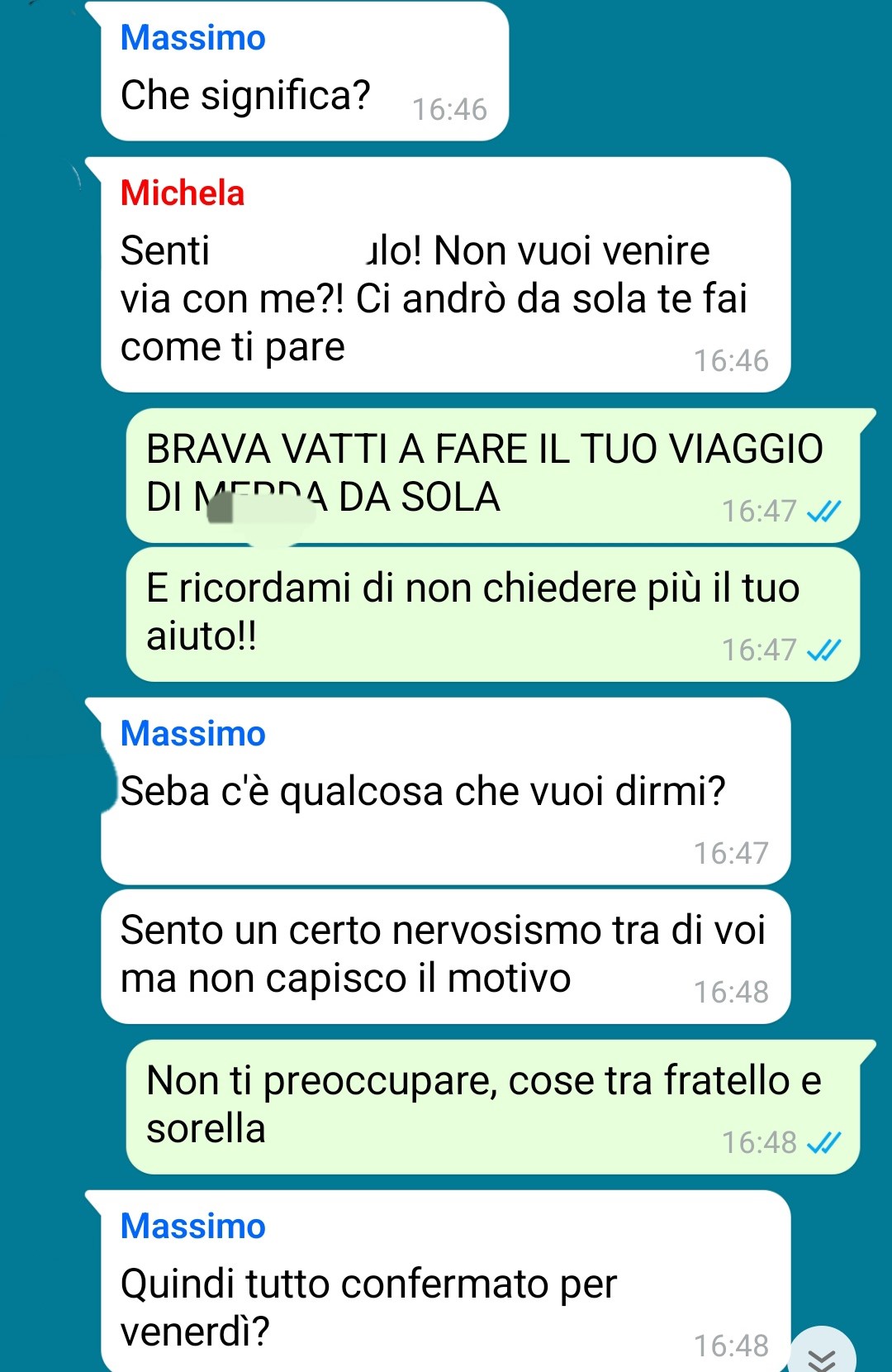 Secondo quanto riferisce il nostro amico, Michela avrebbe avuto un ruolo fondamentale nella gestione della situazione. Almeno in teoria, la sorella avrebbe dovuto intervenire per aiutarlo a uscire da quella proposta indesiderata, fungendo da appoggio e da possibile salvezza. La storia si sviluppa attorno a questo tentativo di equilibrio tra l’amicizia con Massimo, il bisogno di evitare un’esperienza non voluta e il coinvolgimento di Michela come elemento chiave della vicenda.
