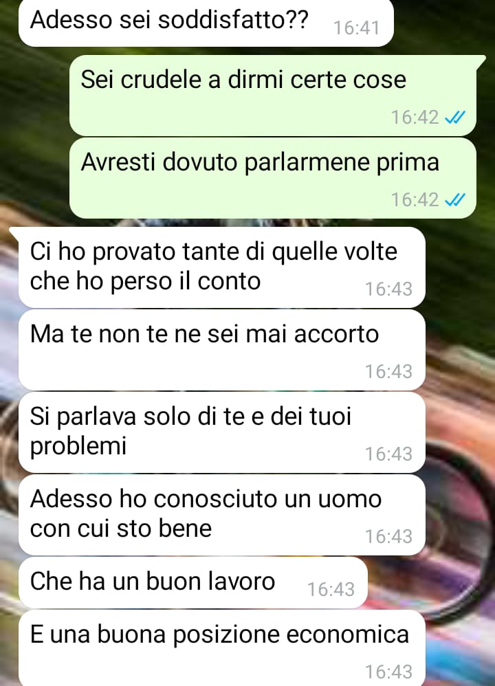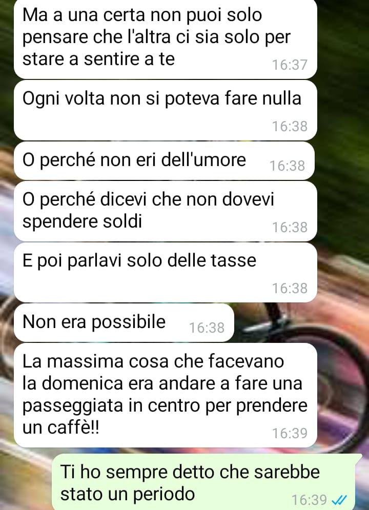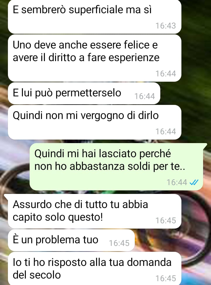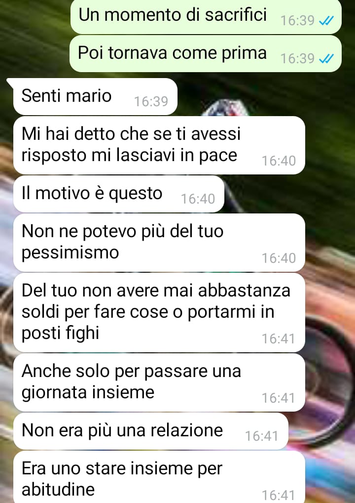 La sua esperienza lo porta a interrogarsi sulle motivazioni che guidano le donne nelle relazioni, in particolare sulla percezione che esse possano dare priorità a fattori materiali piuttosto che ai sentimenti. Mario esprime il suo punto di vista che l’amore vero dovrebbe rendere superflui tutti gli altri aspetti in una relazione. Questa situazione mette in evidenza le difficoltà emotive che possono emergere nella gestione della fine di una relazione e le domande che possono sorgere quando non si ricevono risposte chiare sui motivi della rottura.