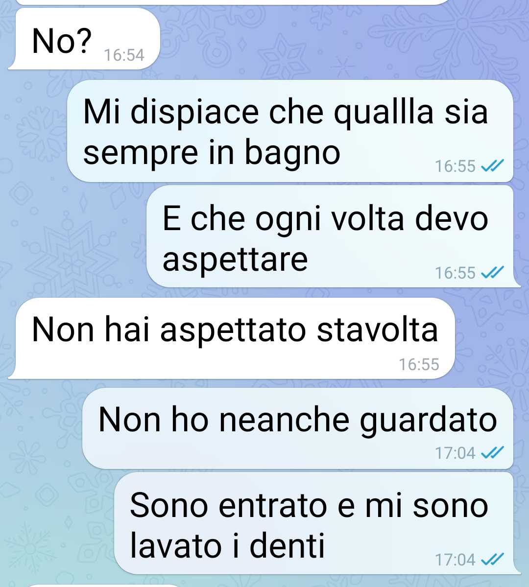 Un nostro fan ha vissuto una situazione domestica che ha causato un malinteso con la sua partner. L’episodio in questione riguarda un incidente avvenuto in casa, dove, a causa della convivenza e degli spazi ristretti, lui ha accidentalmente visto sua sorella minore senza vestiti mentre entrava in bagno, momento in cui lei si trovava sotto la doccia. Questo fatto non è insolito nella dinamica della loro vita familiare, considerando che condividono la stessa abitazione. Dopo l’accaduto, ha deciso di raccontare l’episodio alla sua compagna, cercando di condividere l’esperienza e forse anche di alleggerire la situazione con un po’ di umorismo, non percependo l’accaduto come inappropriato o rischioso, bensì come una semplice casualità della vita domestica. Tuttavia, la reazione della partner non è stata quella che si aspettava. Essendo figlia unica, non ha potuto comprendere appieno la dinamica tra fratelli e ha interpretato l’intera situazione in modo molto diverso, considerandola sconveniente.