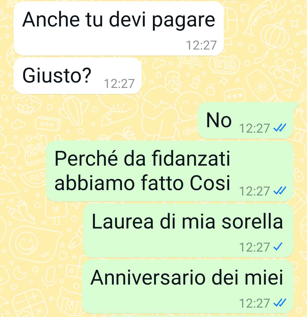 Il nostro fan riferisce che lei e il marito hanno parlato di come organizzarsi per il regalo e lui ha proposto una cifra totale di 200 euro. La nostra follower precisa che, su questa somma complessiva, per lei non ci sarebbero problemi in sé. Il punto di rottura, però, è che il marito pretende che siano proprio lei e lui a dividere il regalo, chiedendole di metterne 100.