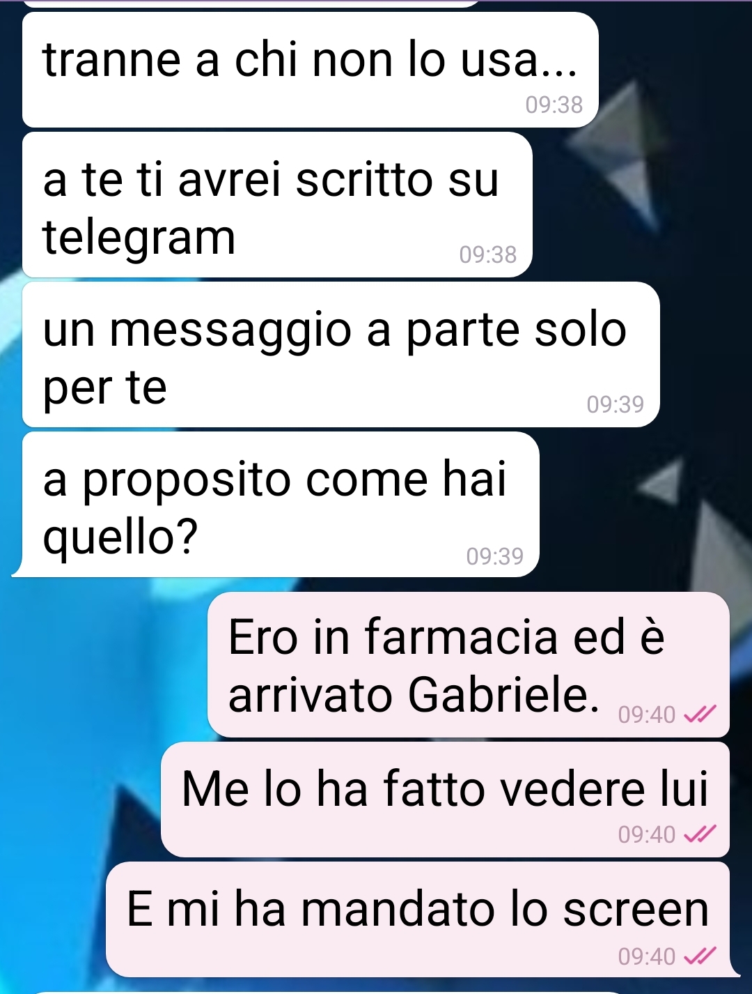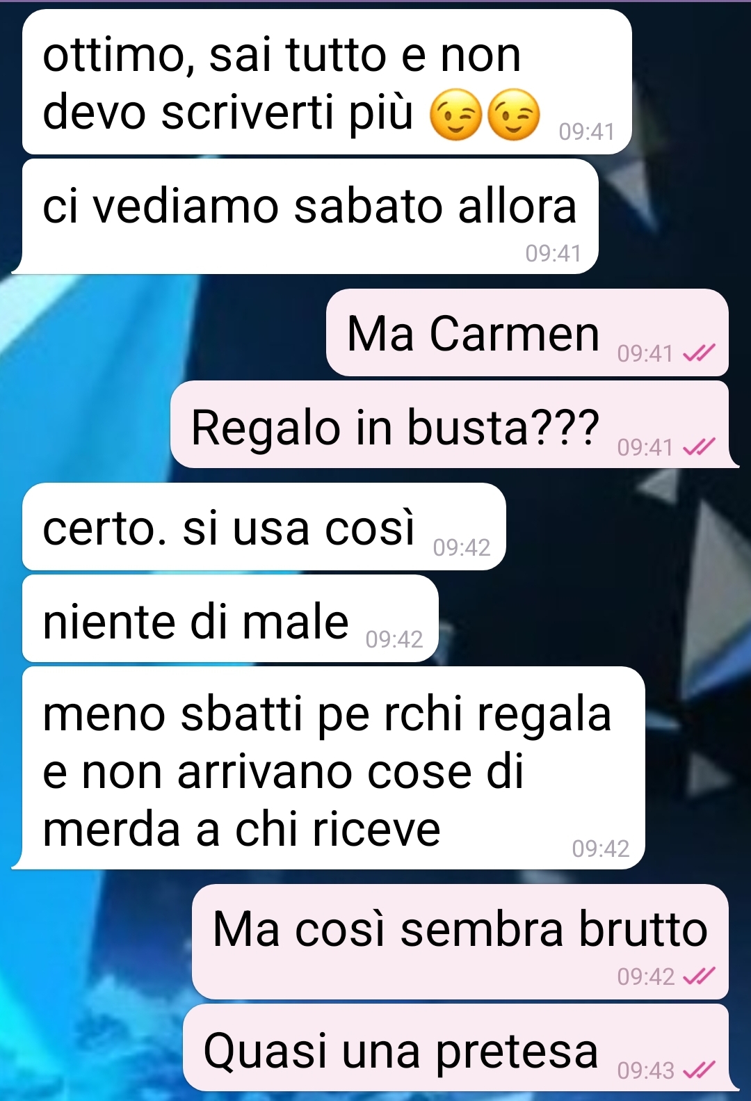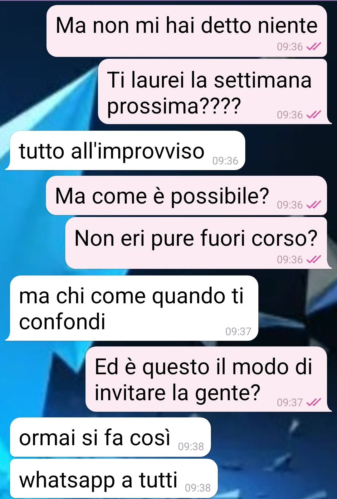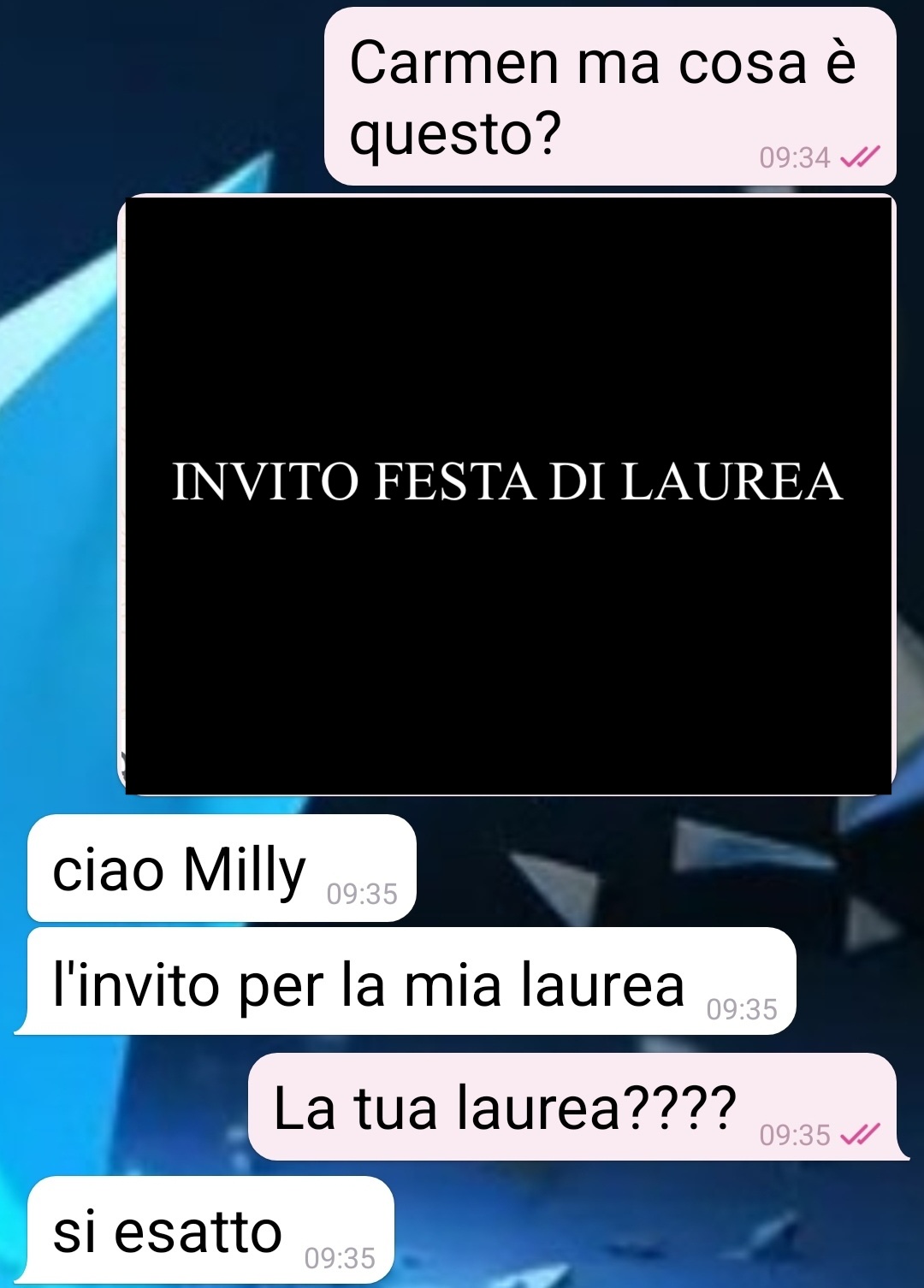 Credo di aver partecipato alla più grande messinscena che si può mettere in piedi per un motivo davvero futile. Ovviamente sono una vittima, e mi sento truffata. Ma mi pare solare come a perderci più di chiunque alla fine sia Carmen, colei che ha intavolato tutto e con cui ho avuto questa chat. Una chat in due fasi, prima e dopo la sua festa di laurea. Un prima e un dopo distanziati da più di una settimana, ovvero da quando ho saputo di una festa e il giorno seguente di questa festa. Parlo di una festa di laurea che la mia amica Carmen ha organizzato dall’oggi al domani, con tutta una serie di cose, dai tempi, alla comunicazione, alle persone coinvolte, alle richieste, che alla fine si è dimostrata una grande presa per il culo. Io già quando ho visto il messaggio che aveva mandato a un amico (e ad altre 60 persone a quanto pare) ci vedevo del torbido in questa laurea improvvisa. Ma chi se lo immaginava tutto quello che è successo poi? Sputtanarsi così la dignità… con tutti i conoscenti…