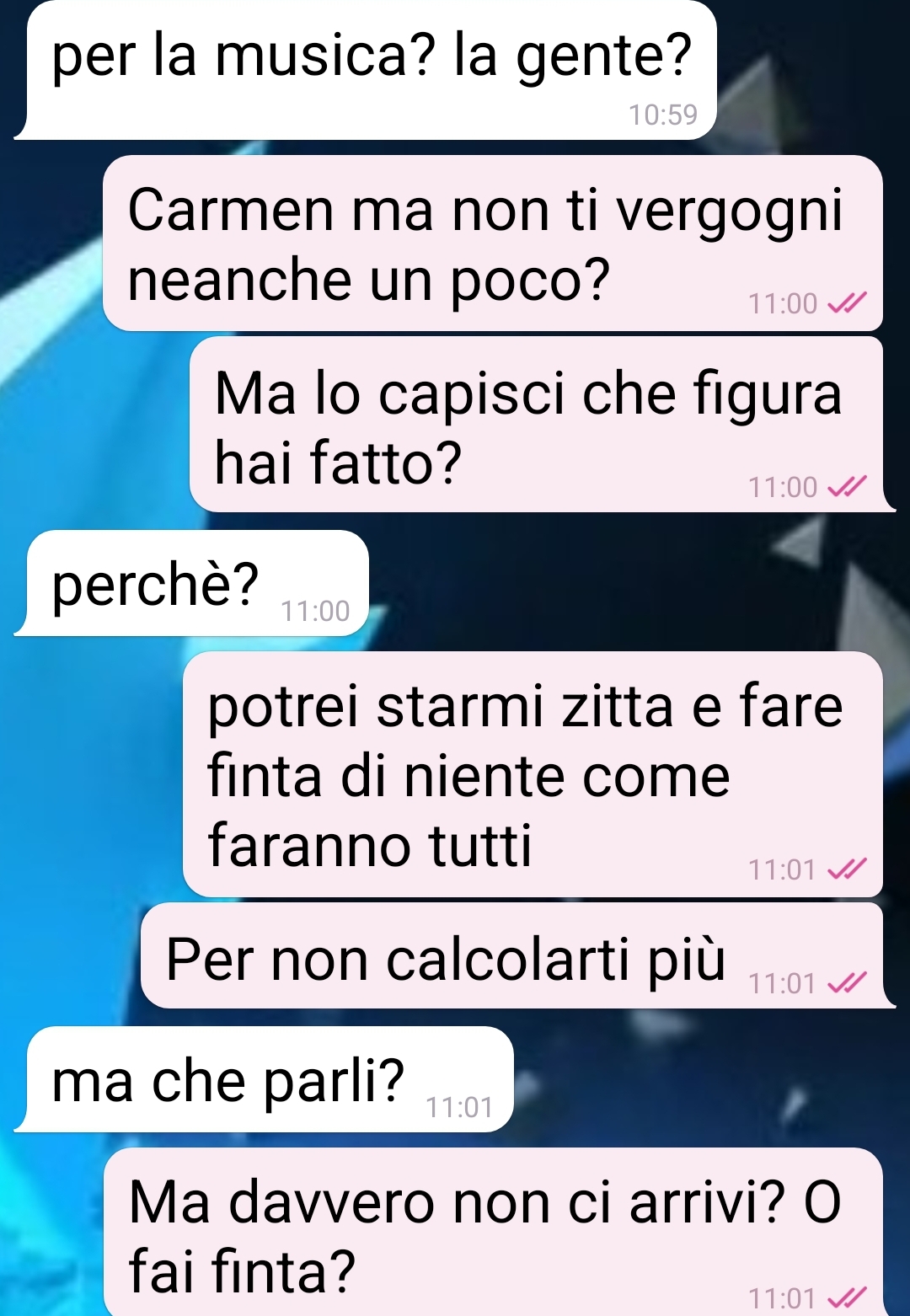 La nostra follower racconta di aver vissuto quella che definisce la più grande messinscena mai organizzata per un motivo apparentemente banale. L’amica si sente vittima di quello che considera un vero e proprio inganno, ma riconosce che la persona che ha subito il danno maggiore è Carmen, la protagonista di questa vicenda. La fan descrive come tutto sia iniziato con una conversazione divisa in due momenti distinti, prima e dopo un evento che si sarebbe rivelato molto diverso da quello che appariva.