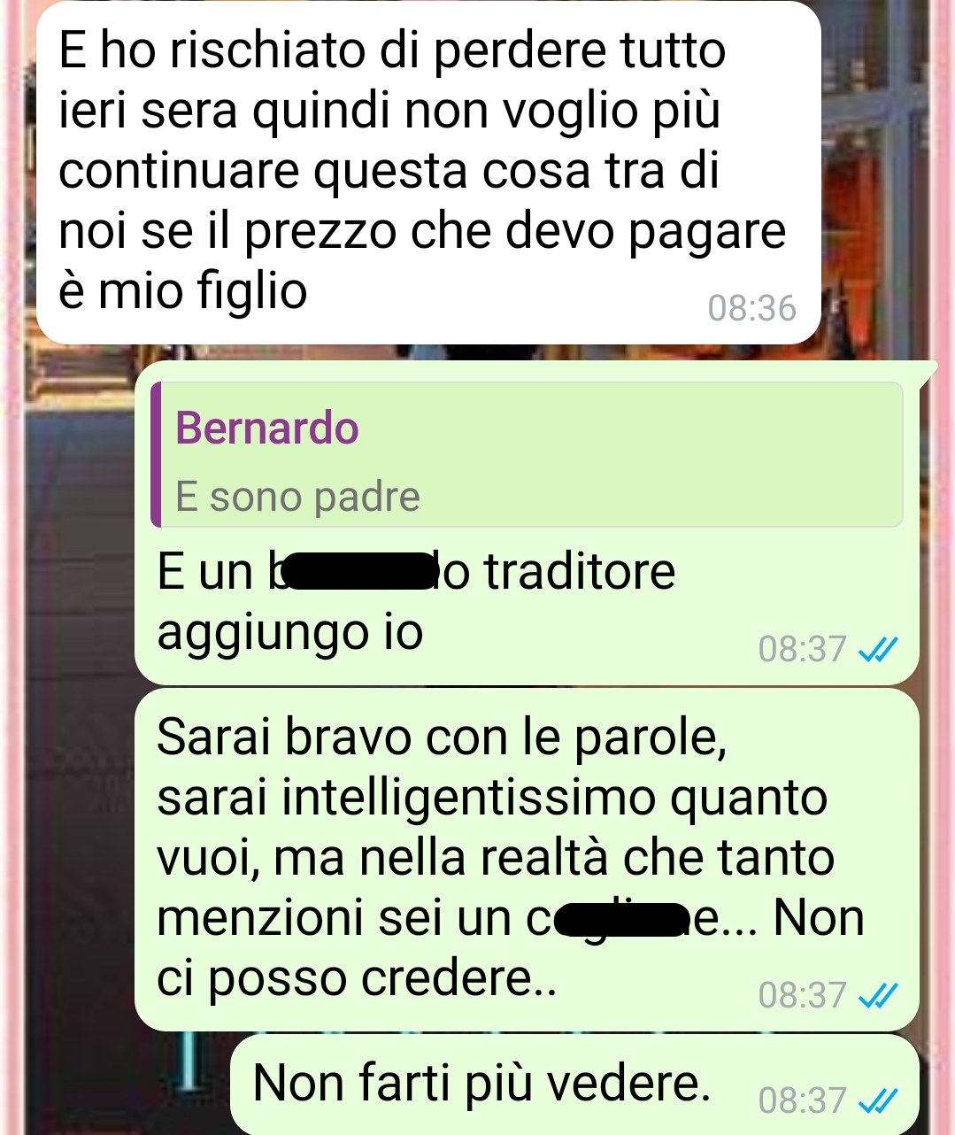 Secondo il racconto dell’amica, però, le cose non sono andate come sperava. Ripensando a quella conoscenza, la nostra fan racconta di essersi resa conto di essersi sbagliata anche questa volta. Proprio per questo motivo, mentre stava cancellando la chat, ha deciso di fermarsi un attimo a rileggere l’ultima conversazione avuta con Bernardo. L’amica spiega che quella conversazione risale a circa un mese dopo l’inizio della loro frequentazione.