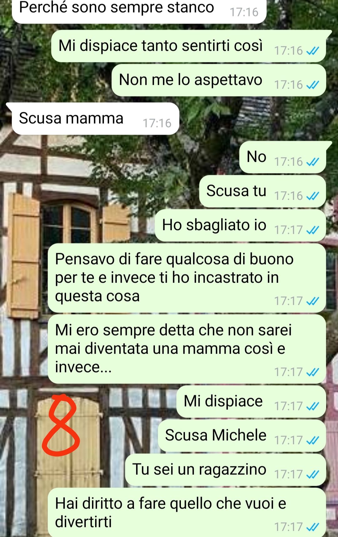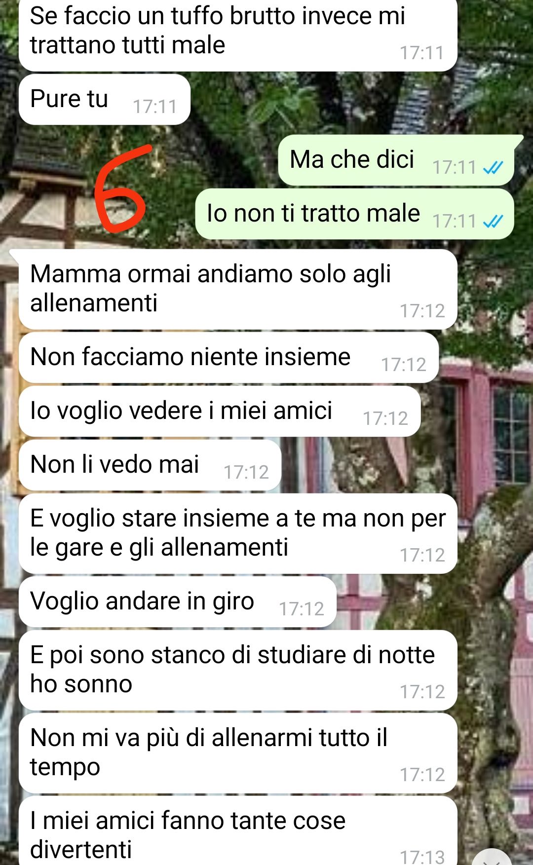 Una madre, la mamma di Michele, condivide la sua esperienza e le sue riflessioni riguardo al percorso sportivo del figlio. Michele, ormai adolescente, pratica i tuffi a livello agonistico da diversi anni. Fin da piccolo, Michele si è mostrato molto bravo in questo sport, e la madre ha deciso di investire molto nella sua passione, nella speranza che potesse diventare una possibilità concreta per il suo futuro. Quando ha iniziato, Michele era felice e motivato. Con il tempo, gli allenamenti sono diventati più intensi, e il suo stile di vita è cambiato come accade spesso per chi pratica sport a livello agonistico. Nonostante tutto, la madre lo vedeva comunque soddisfatto dei suoi risultati e non ha mai sospettato che potesse voler abbandonare quel percorso. Michele è sempre stato un ragazzo riservato, che parlava poco ma era sempre obbediente ed educato, e questo non ha mai portato a discutere la possibilità di smettere con i tuffi.