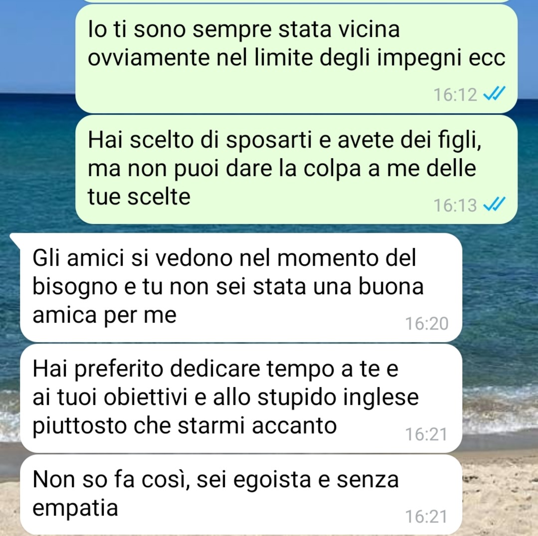 Attraverso le sue parole emerge il bisogno di essere accolta per ciò che è, per il percorso che ha scelto di intraprendere con coraggio. Un bisogno che, purtroppo, non ha trovato risposta nell’amica più vicina, lasciandole addosso un senso di incomprensione e delusione difficile da scrollarsi di dosso.