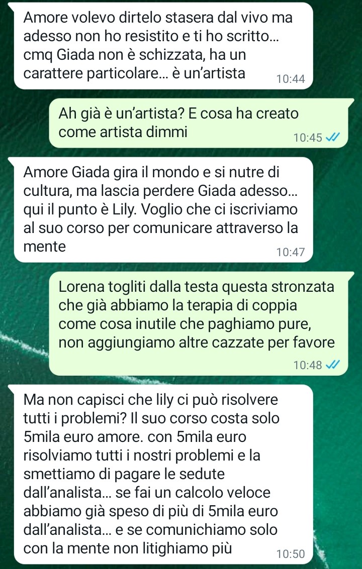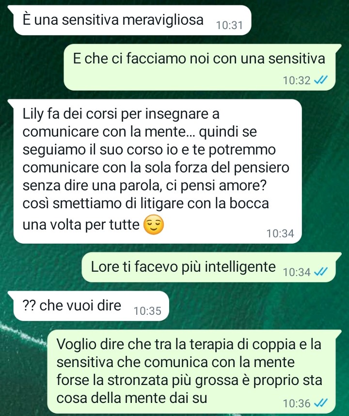 “mi chiamo Armando e sono un condannato a vita a causa della mia compagna Lorena. Io e Lorena stiamo insieme da tanti anni e sappiamo fare bene solo una cosa: litigare dalla mattina alla sera. Un anno fa Lorena mi ha costretto ad iniziare una terapia di coppia – cosa a cui non ho mai creduto – con il risultato che ora litighiamo anche più di un anno fa; siamo completamente incompatibili, l’abbiamo sempre saputo ma nessuno dei due ha il coraggio di lasciare l’altra persona. Stamattina però la mia compagna se n’è uscita con una trovata allucinante che io ho subito rifiutato e chissà se questa è la volta buona che la mando davvero a quel paese per sempre. Vi anticipo solo che Lorena mi ha detto di aver trovato una “soluzione” che potrebbe farci smettere di litigare e finirla pure con la terapia di coppia. Io lì per lì le ho risposto “amore se la tua soluzione può farci evitare di spendere soldi inutili in terapie e psicologi che ben venga, mettiamola subito in pratica”… quando però Lorena mi ha spiegato di cosa si trattava sono rimasto impietrito rispetto a quanto possa essere stupida ed ingenua la mia compagna. Leggete la chat che ho avuto prima con lei e capirete subito che tipo di “soluzione” avrebbe trovato la mia compagna per smettere di litigare e risolvere così la nostra crisi di coppia perenne. Senza parole davvero.”