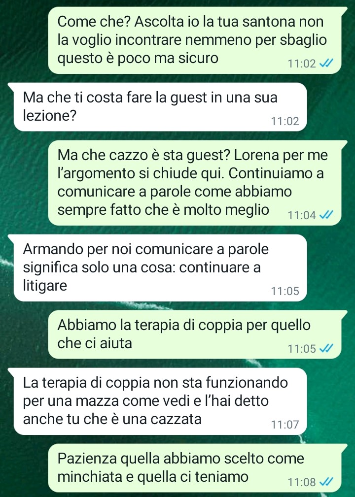 Il nostro fan Armando racconta la sua difficile relazione con la compagna Lorena, con cui sta insieme da molti anni. La loro convivenza sembra essere caratterizzata da una continua conflittualità, al punto che, come dice lui stesso, la loro unica abilità sembra essere quella di litigare incessantemente dalla mattina alla sera. Nonostante questa evidente incompatibilità, entrambi sembrano incapaci di prendere la decisione di separarsi.