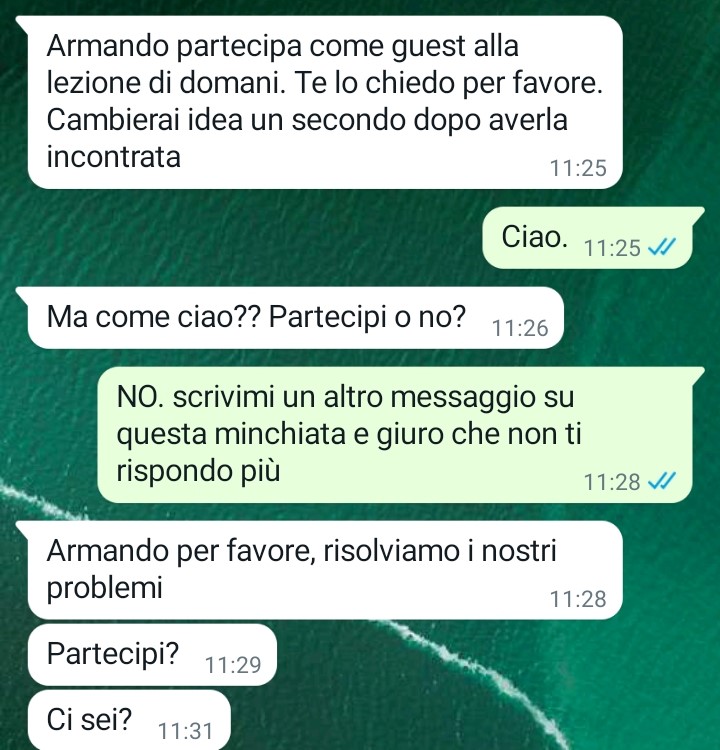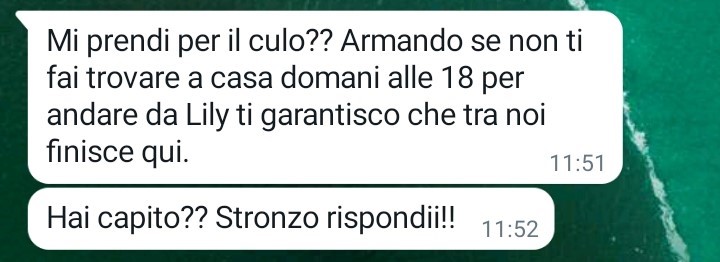 Non anticipa nei dettagli la proposta di Lorena, ma invita a leggere la conversazione che ha avuto con lei per comprendere la natura della “soluzione” che la sua compagna ha suggerito. Armando si chiede se questa situazione rappresenti finalmente il punto di rottura definitivo, che potrebbe portarlo a chiudere definitivamente una relazione che definisce insostenibile.